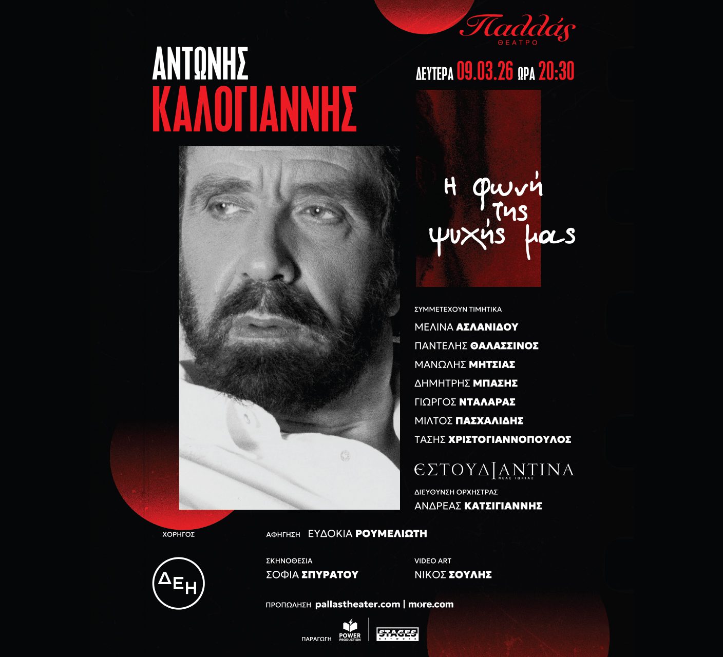Τη Δευτέρα 9 Μαρτίου 2026, το Θέατρο Παλλάς στις 20:30 ανοίγει την αγκαλιά του για να φιλοξενήσει μια ξεχωριστή μουσική βραδιά αφιερωμένη στη μνήμη και στο έργο του σπουδαίου ερμηνευτή Αντώνη Καλογιάννη, με την ευγενική υποστήριξη της ΔΕΗ.