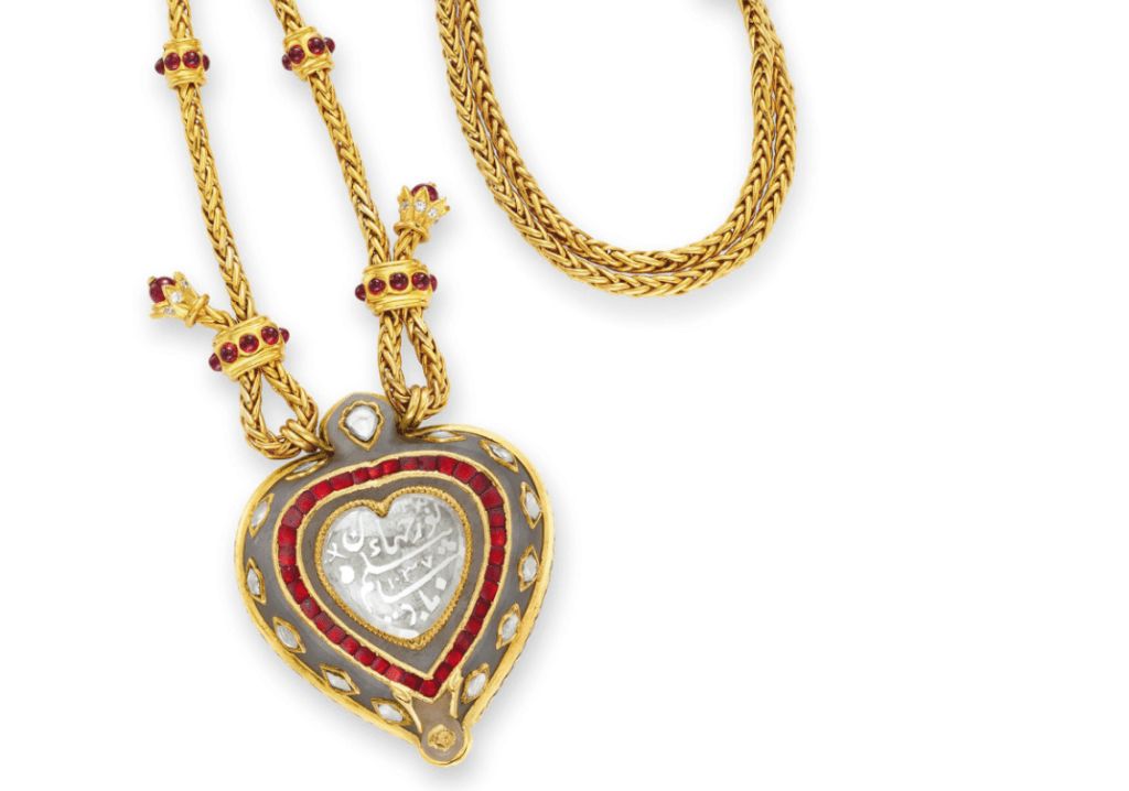 Η αυτοκρατορική καρδιάΤο μενταγιόν Taj Mahal είναι ένα επίπεδο, καρδιόσχημο διαμάντι με χαραγμένες περσικές επιγραφές, που φέρεται να δημιουργήθηκε τον 17ο αιώνα στην αυλή του Μουγκάλ αυτοκράτορα Shah Jahan. Ο ίδιος το χάρισε στη σύζυγό του Mumtaz Mahal, σαν ένδειξη αιώνιας αγάπης, την ίδια γυναίκα για την οποία αργότερα έχτισε το μαυσωλείο Taj Mahal. Ένα κόσμημα που γεννήθηκε από τον έρωτα και θρήνο ενός αυτοκράτορα, επρόκειτο να βρει νέα ζωή, αιώνες μετά, στον λαιμό μιας γυναίκας που έγινε η επιτομή του χολιγουντιανού πάθους.