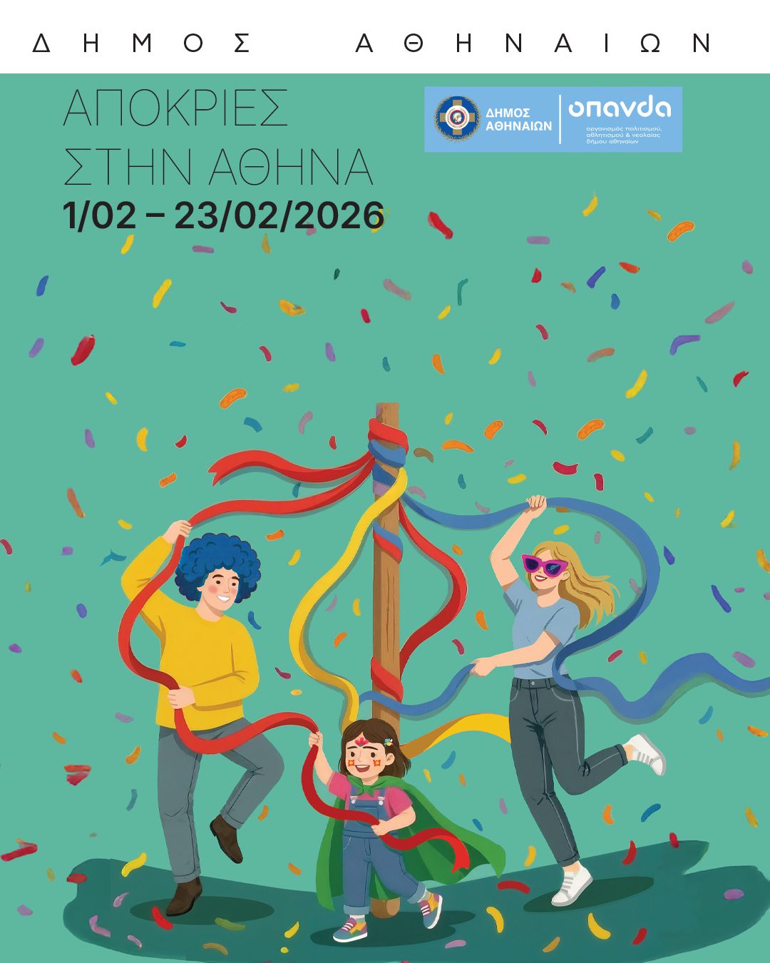 Η γεμάτη κέφι και ρυθμό Αθηναϊκή Αποκριά έρχεται και φέτος για να παρασύρει τις γειτονιές της πόλης στον παλμό του καρναβαλιού, με το παραδοσιακό γαϊτανάκι της να απλώνεται σε πλατείες, δρόμους και χώρους πολιτισμού στις επτά δημοτικές κοινότητες. Ο Δήμος Αθηναίων προσκαλεί μικρούς και μεγάλους, κατοίκους και επισκέπτες της πόλης, να γίνουν μέρος της πολύχρωμης γιορτής. Το πρόγραμμα εκδηλώσεων, που επιμελείται ο Οργανισμός Πολιτισμού, Αθλητισμού και Νεολαίας Δήμου Αθηναίων (ΟΠΑΝΔΑ), θα διαρκέσει έως τις 23 Φεβρουαρίου.