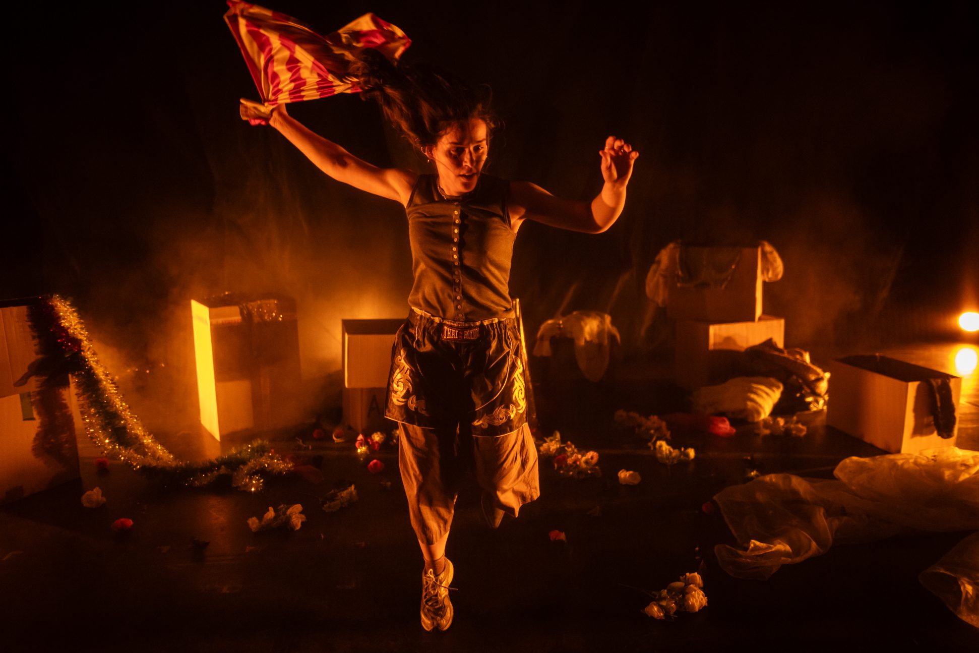 Για αρχή, η Έλενα Αντωνίου με το «ΟDE». Η ΕλληνοΚύπρια χορογράφος επανήρθε στη Στέγη μετά το «Landscape» του 2023 – που την έφερε ελπιδοφόρα σε αρκετές σκηνές της Ευρώπης – για να παραμείνει προσηλωμένη στην θεματική της γυναικείας χειραφέτησης εντός του πατριαρχικού κόσμου. Στο -1 της Στέγης, την είδα να γίνεται πολλές γυναίκες. Ντυμένη σε ένα κοστούμι στο χρώμα του δέρματος, ευάλωτη από τη μια και με αρχέγονη δύναμη από την άλλη, χτυπούσε το πόδι της σαν πολεμικό ταμπούρλο, κάθε φορά που ένα καινούργιο πρόσωπο αναδυόταν στη σκηνή: ήταν μια γυναίκα που παραιτείται, κουράζεται, απελπίζεται αλλά και μια γυναίκα που ξαναβρίσκει το θάρρος της, αγωνίζεται. Το χέρι της προταγμένο σε γροθιά, το χέρι της που καλεί ερωτικά σαν σειρήνα και που σε δευτερόλεπτα σχηματίζει την κάνη ενός όπλου. Για μια στιγμή αυνανίζεται και την επόμενη κοιλοπονάει, λες και περιμένει να γεννήσει το μωρό της. Η Αντωνίου πέφτει και σηκώνεται σε μια επώδυνη λούπα, την ώρα που η grunge κιθάρα της μουσικού Μαρία Σπίβακ (η οποία περιφέρεται σαν σκιά γύρω της) μοιάζει να ορίζει χρονικά αυτόν τον κύκλο της γυναικείας ζωής σε συχνότητα μάχης.