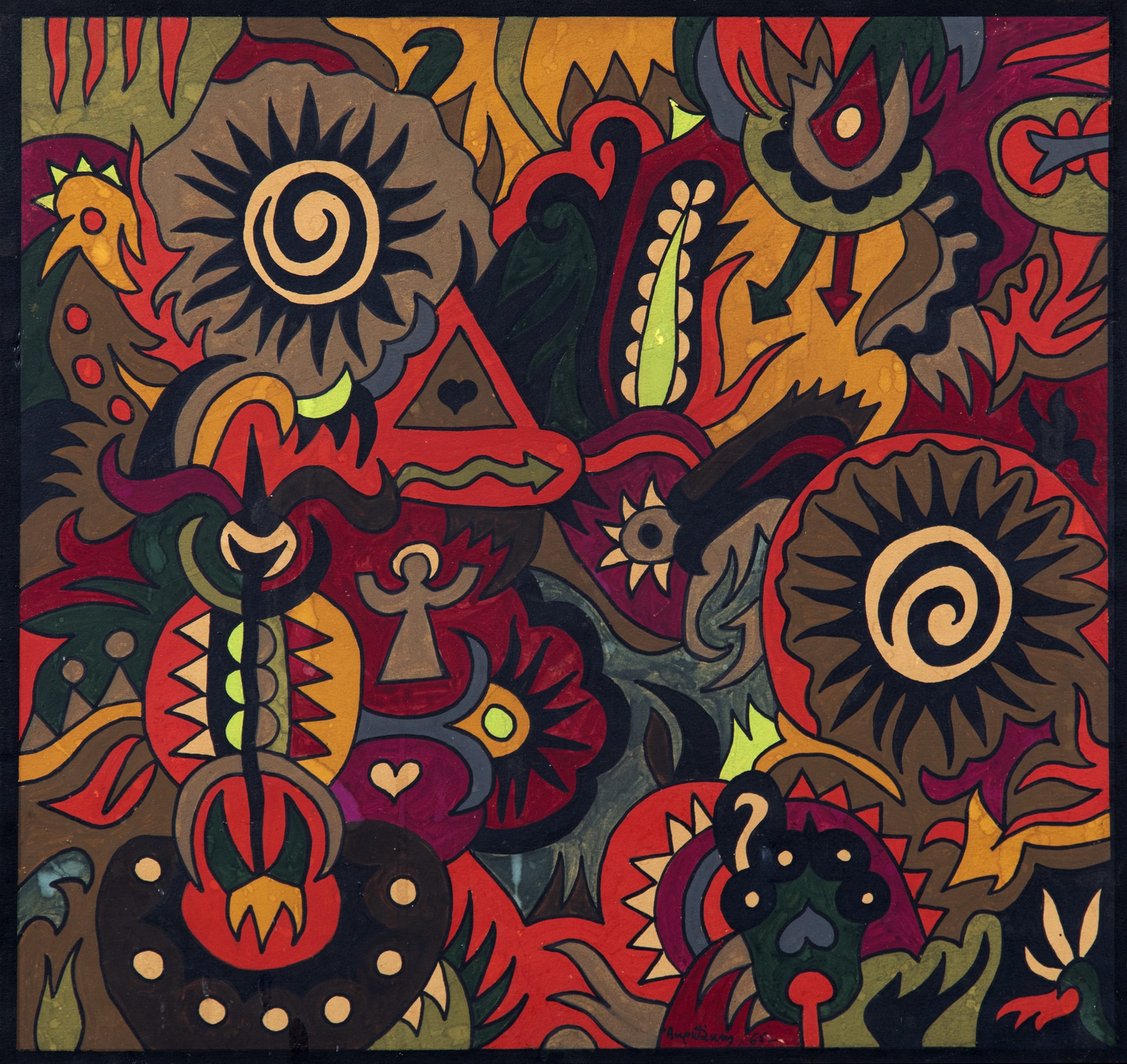 Η παρουσίαση των έργων γίνεται χρονολογικά, παρακολουθώντας τις δημιουργικές περιόδους του καλλιτέχνη, φιλοξενώντας έργα που σε μεγάλο βαθμό δεν έχουν παρουσιαστεί ξανά στο κοινό, όπως τα πρώιμα πορτρέτα φίλων που φιλοτέχνησε πριν στραφεί αποφασιστικά στο έντονα χρωματικό ψυχεδελικό underground της δεκαετίας του 1960 – οι μεγαλύτεροι θα θυμούνται τις κατακόκκινες γλώσσες φωτιάς στο εξώφυλλο του δίσκου του Σαββόπουλου «Μπάλλος», στα χρόνια της δικτατορίας.