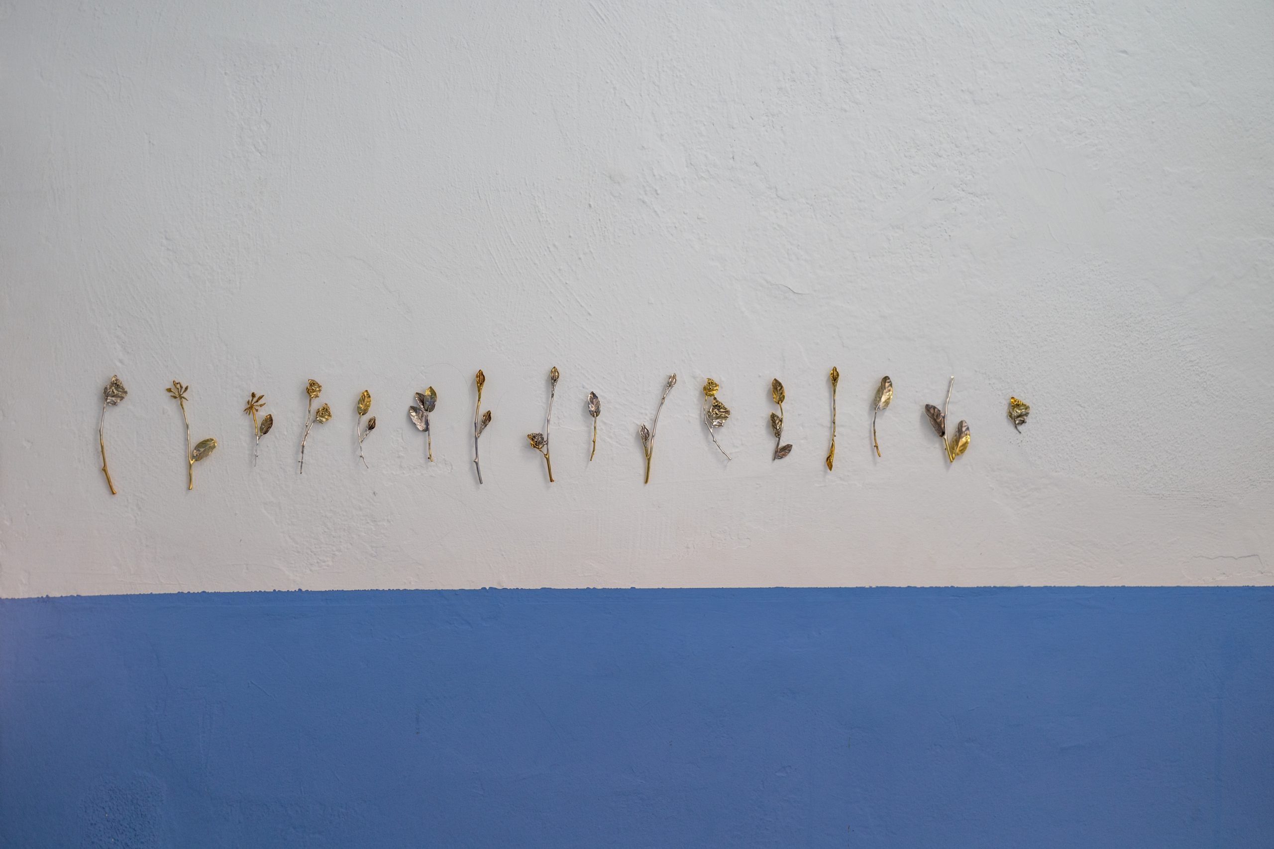 Οι πίνακες της Ευγενίας Βερελή σταμάτησαν για λίγο τον χρόνο, καθώς μερικά αποξηραμένα λουλούδια θα μείνουν για πάντα ζωντανά πίσω από ένα γυαλί και κρεμασμένα στον τοίχο. Μερικά μεταλλικά λουλούδια πάλι, δημιουργίες της Χρυσάνθης Κουμιανάκη, συνδυάζουν τη δική της οικογενειακή ιστορία του εργαστηρίου κοσμημάτων με τις βόλτες που κάνει με την κόρη της μαζεύοντας λουλούδια. Τα γλυπτά που εν τέλει δημιούργησε ήταν κολάζ μετάλλου που κάπως θυμίζουν τη δαντέλα στον λαιμό του μπούστου.
