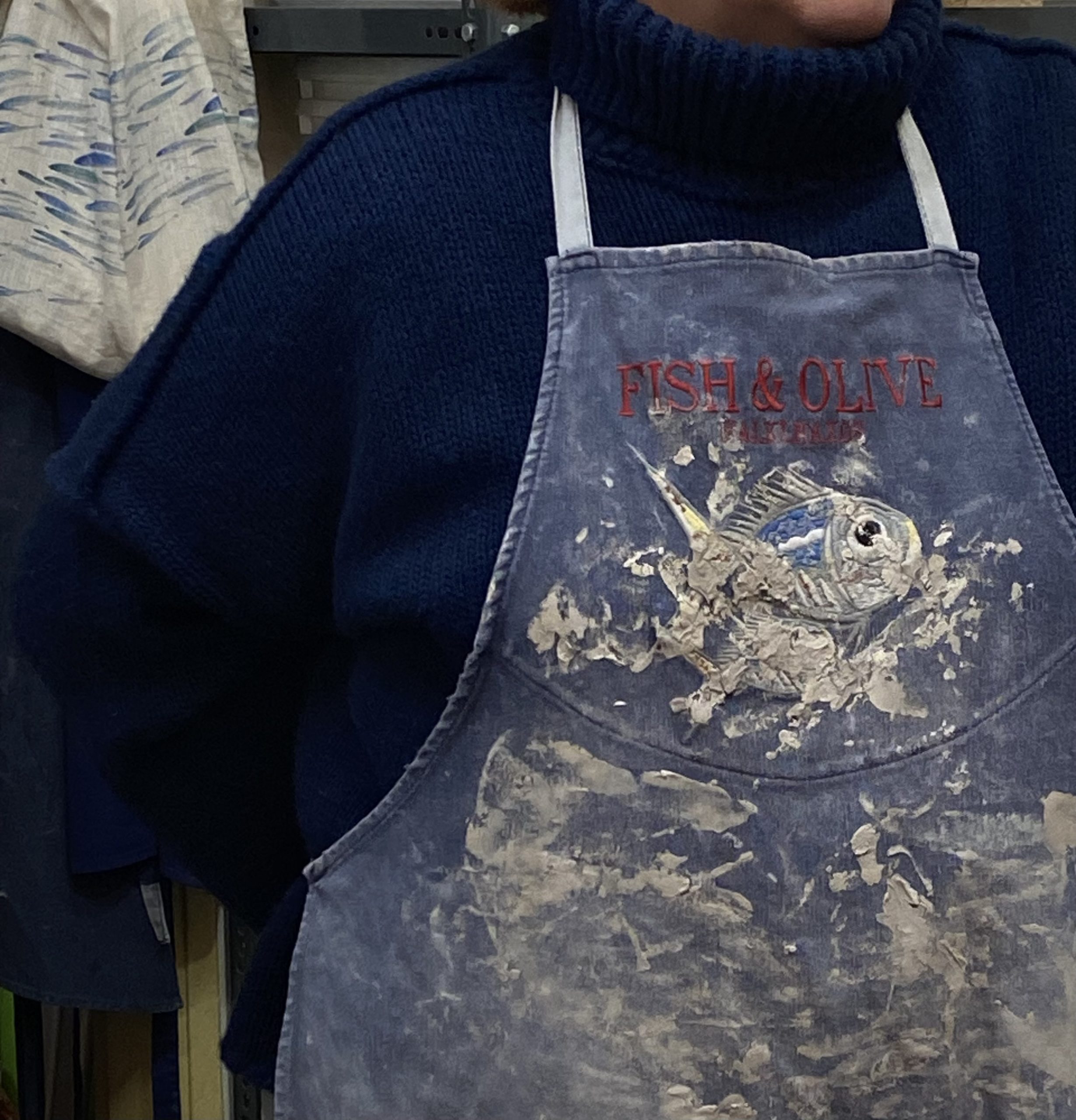 Στη διπλανή ακριβώς πόρτα από εκείνη του εργαστηρίου γνωρίσαμε τον Alexander Reinhart που πριν από περίπου 30 χρόνια ήρθε στο Χαλκί της Νάξου και δημιούργησε από τις πρώτες επιχειρήσεις στο χωριό (ίσως την πρώτη). Δική του έμπνευση ήταν το Fish & Olive, και το κατάστημα και η γκαλερί μετέπειτα. Τα χαρακτηριστικά ψαράκια ή το κλαδί ελιάς ή τα βατραχάκια πάνω στα κεραμικά είναι σχέδια που ξεχωρίζουν τις δημιουργίες τους εδώ και δεκαετίες.