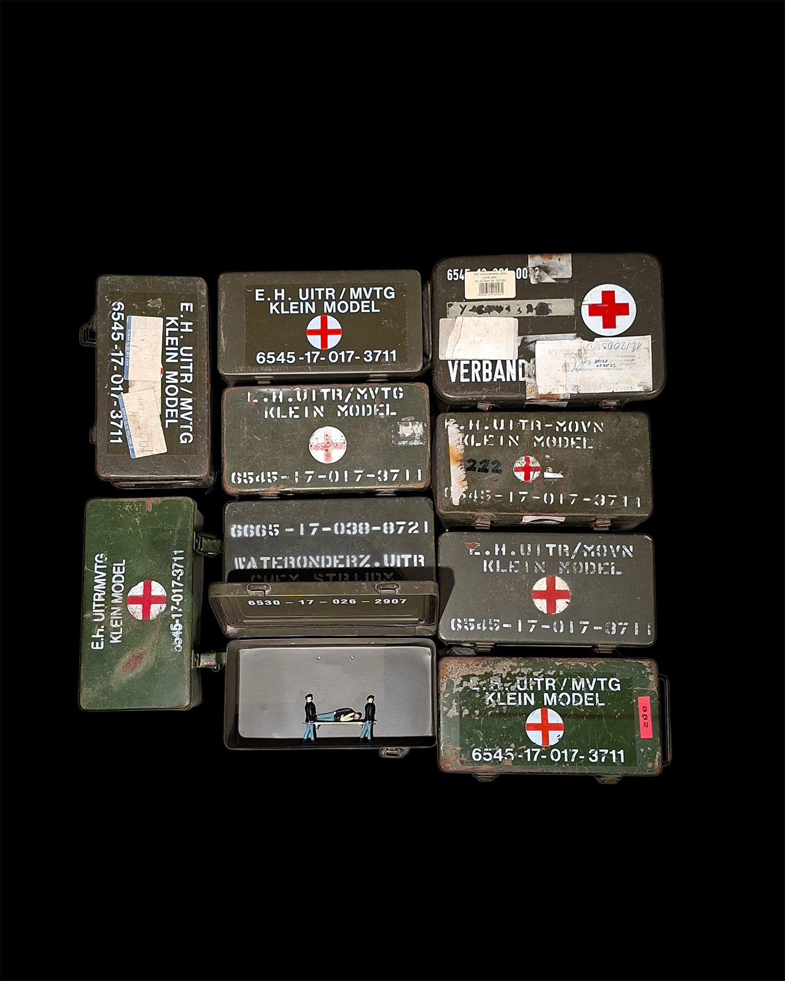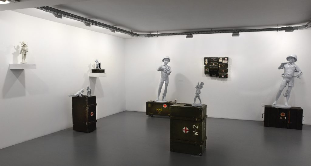 Όταν όμως ο θεατής πλησιάσει κοντύτερα, καταλαβαίνει ότι η αθωότητα αυτή είναι απατηλή. Η λευκότητα είναι το πέπλο που με δυσκολία κρύβει ένα πεδίο μάχης: κάθε ένα από τα γλυπτά αυτά έχει να αφηγηθεί μια ιστορία βίας και πολέμου. Αυτό τονίζει η επιτοίχια σύνθεση από στρατιωτικά κουτιά πρώτων βοηθειών με την οποία, τρόπον τινά, ολοκληρώνεται η περιήγηση του επισκέπτη στην αίθουσα. Αλλά και το γεγονός ότι ανάλογα κουτιά χρησιμοποιούνται ως βάθρο για τα αγάλματα, όσο πλησιάζουμε προς το νοητό τέλος.