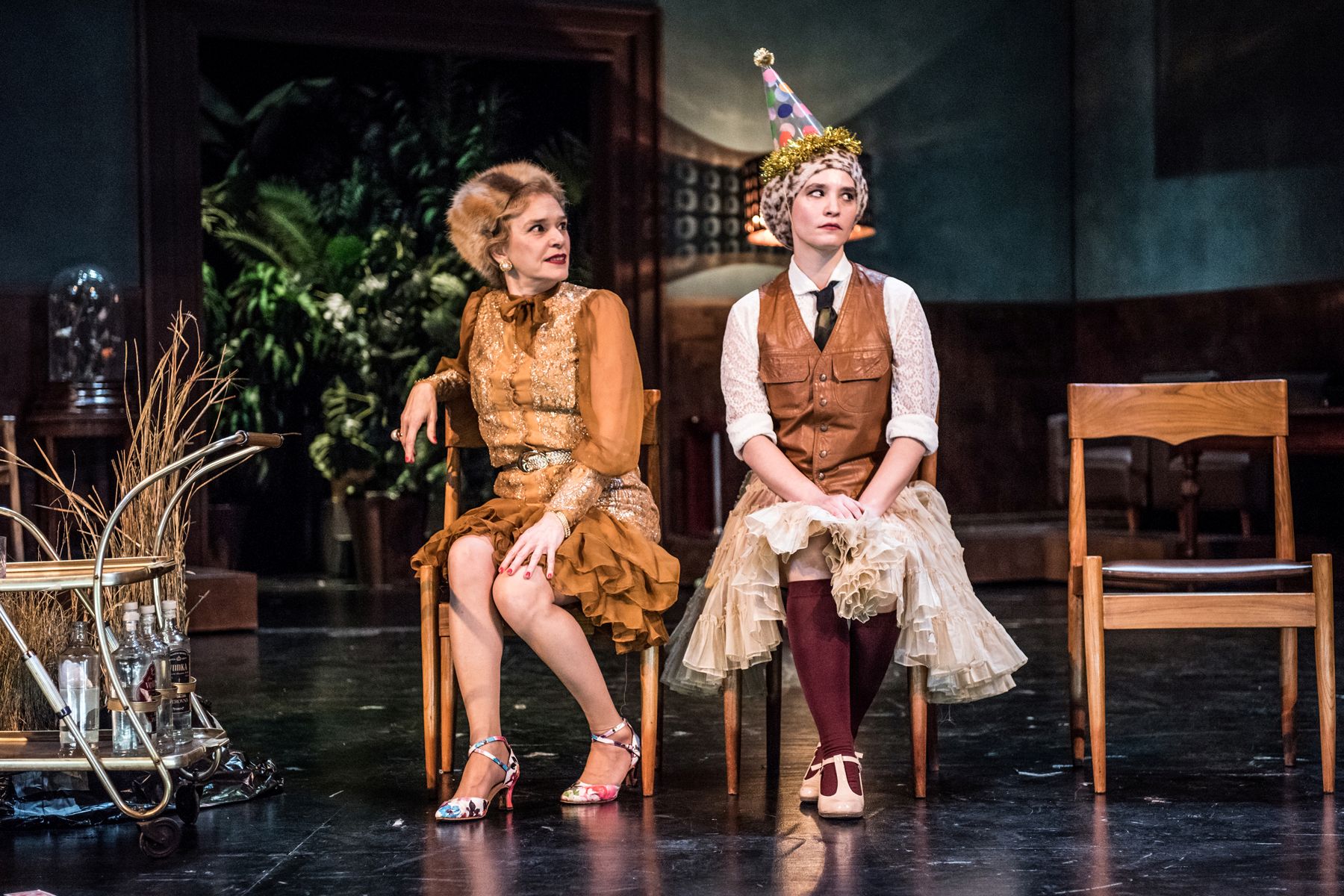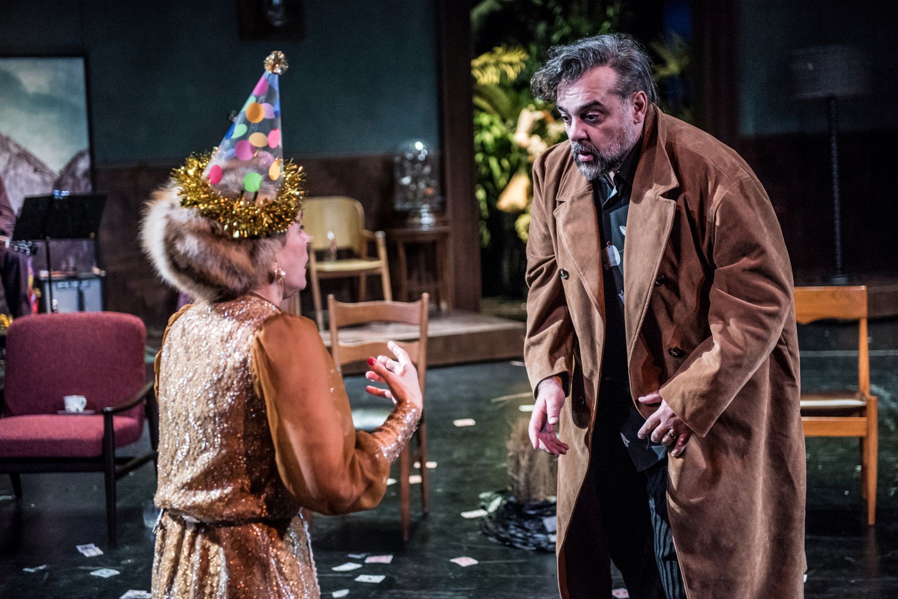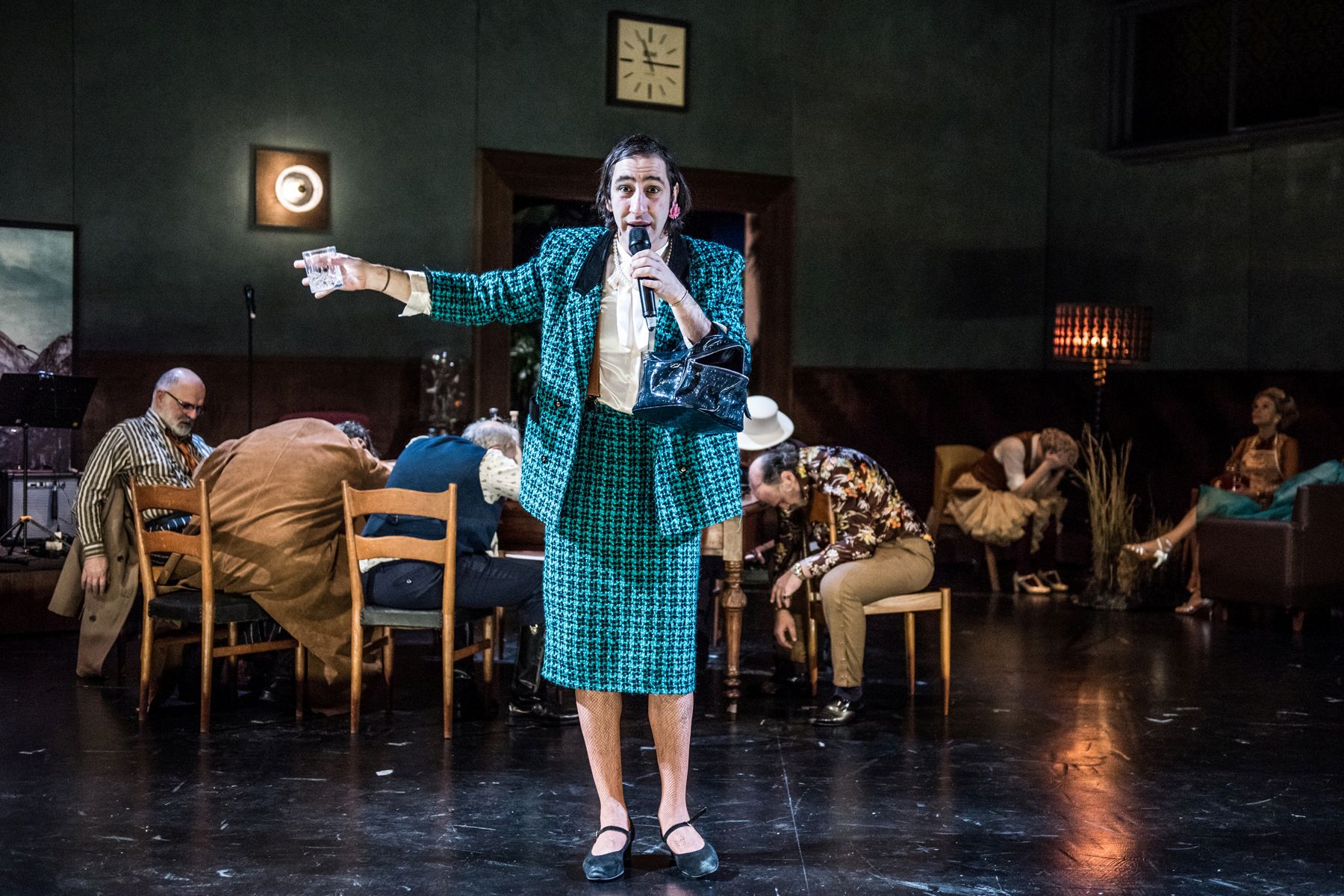 Η αισθητική της παράστασηςΕκ πρώτης όψεως θα μπορούσε να είναι ένας παρακμιακός χώρος εκδηλώσεων του κομμουνιστικού καθεστώτος. Τελικά, η ανοιχτή, σε πολλές ερμηνείες, σκηνογραφία της Εύας Μανιδάκη (με ένα μικρό θεωρείο παράλληλης δράσης), μέσα στη μουσική του Ρέϊνινγκερ, μεταμορφώνεται (στα μάτια μου) σε μια σάλα στη μέση της αμερικανικής ερήμου, αντανακλώντας και την ψυχική ερημία όλων αυτών των προσώπων. Όσο κι αν η Ιωάννα Τσάμη τους ντύνει γκροτέσκα, πολύχρωμα και γιορτινά, η θλίψη παραμένει εκκωφαντική σε αυτό το σκηνικό περιβάλλον που αναβαθμίζεται σημαντικά από τους ατμοσφαιρικότατους φωτισμούς της Ελίζας Αλεξανδροπούλου.