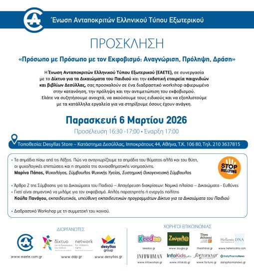 Με αφορμή την Παγκόσμια Ημέρα κατά της Ενδοσχολικής Βίας και του Εκφοβισμού, η Ένωση Ανταποκριτών Ελληνικού Τύπου Εξωτερικού (ΕΑΕΤΕ), σε συνεργασία με το Δίκτυο για τα δικαιώματα του Παιδιού και την εκδοτική εταιρεία παιχνιδιών και βιβλίων, Δεσύλλας, διοργανώνουν μια επίκαιρη και ουσιαστική συζήτηση, με θέμα την αντιμετώπιση του εκφοβισμού σε όλες του τις εκφάνσεις, την Παρασκευή, 6 Μαρτίου 2026, στις 17:00, στο Desyllas Store – Κατάστημα Δεσύλλας, Ιπποκράτους 44, Αθήνα, Τ.Κ. 106 80.