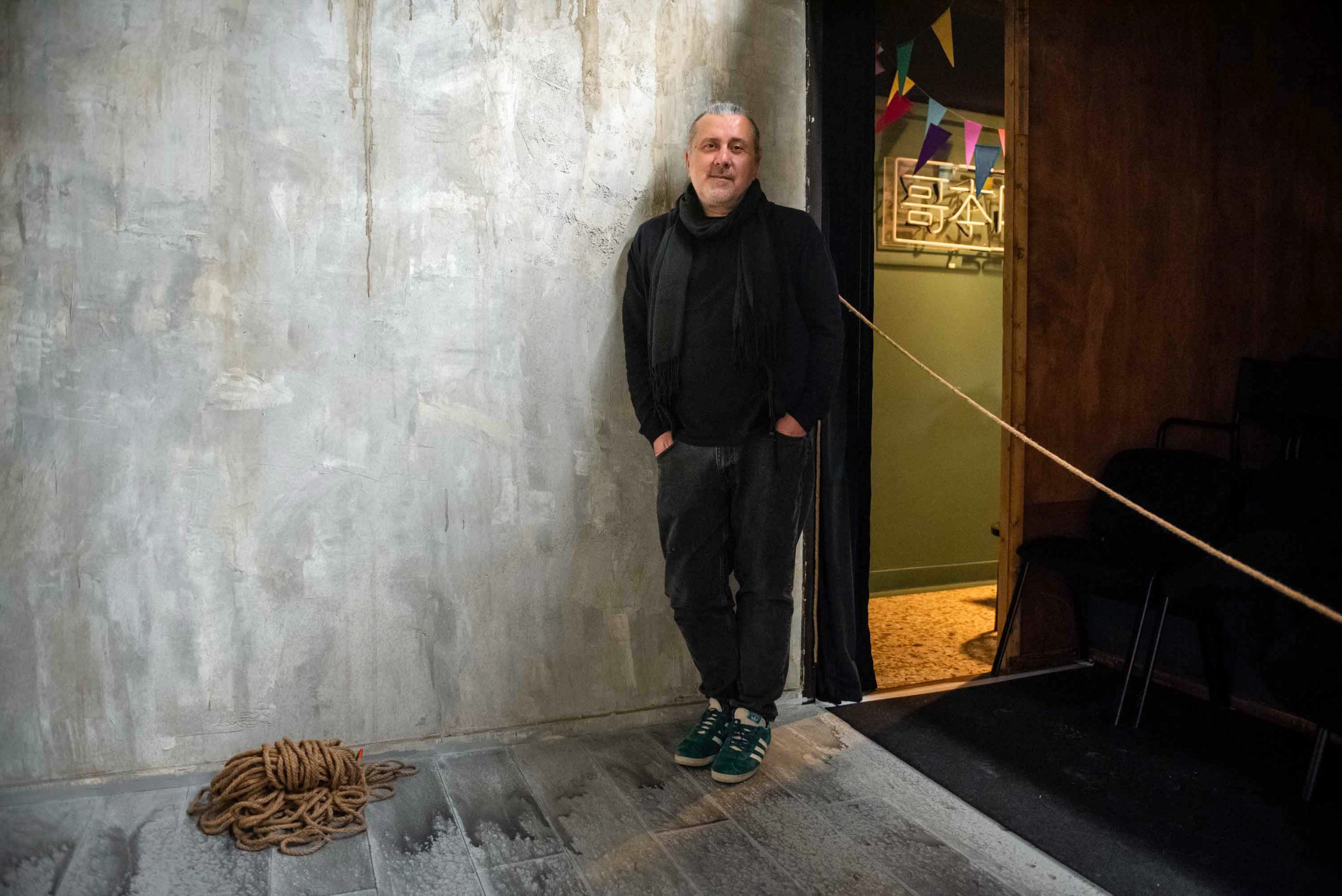 Στο μικρό καμαρίνι, καθιστικό, ησυχαστήριο του Hood της Bijoux de Kant, στην καρδιά του Μοναστηρακίου, o Γιάννης Σκουρλέτης μοιάζει να έχει δημιουργήσει ένα χώρο μυσταγωγικό, με σκηνικά – δάνεια από παλιές παραστάσεις κι ένα φωτισμό που παραπέμπει σε εικονοστάσι. Ψηλά, στη μια πλευρά του τοίχου, κρέμονται τα ξύλινα φτερά από την «Γυναίκα και τον Ακροβάτη» όπως τα φορούσε η Αμαλία Μουτούση στο υπερεπιτυχημένο ανέβασμα του έργου του Μιχάλη Βιρβιδάκη.