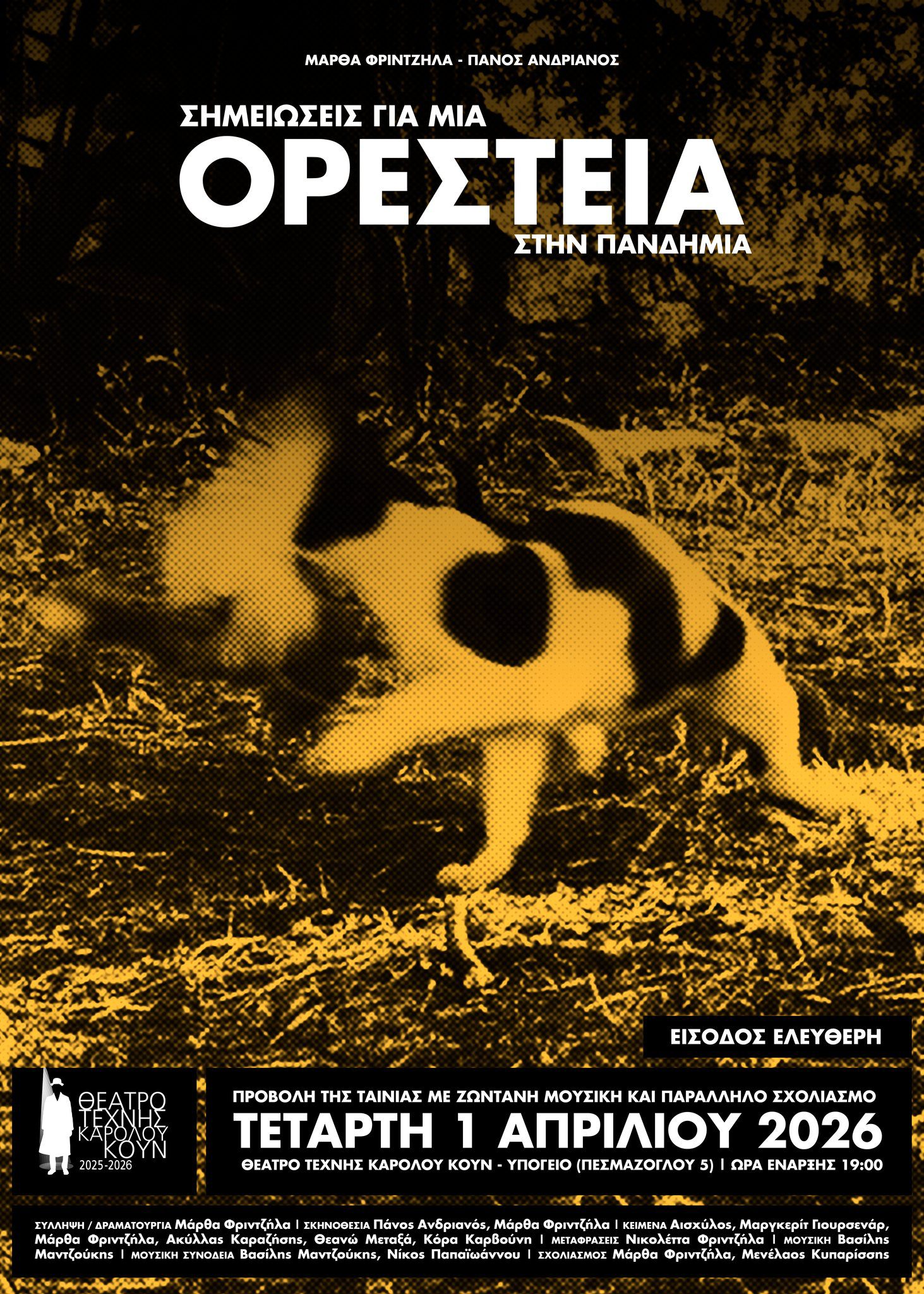 Η ταινία «Σημειώσεις για μια Ορέστεια στην πανδημία» της Μάρθας Φριντζήλα και του Πάνου Ανδριανού παρουσιάζεται στο Υπόγειο του Θεάτρου Τέχνης Καρόλου Κουν, σε μια ξεχωριστή βραδιά προβολής με ζωντανή μουσική, παράλληλο σχολιασμό και ελεύθερη είσοδο.