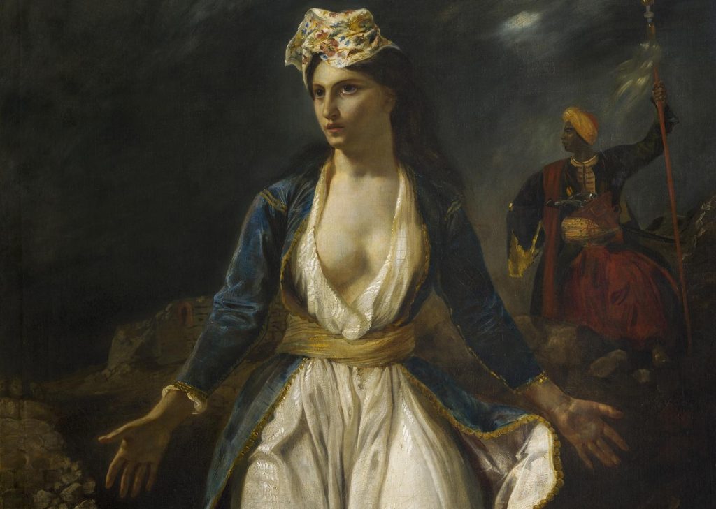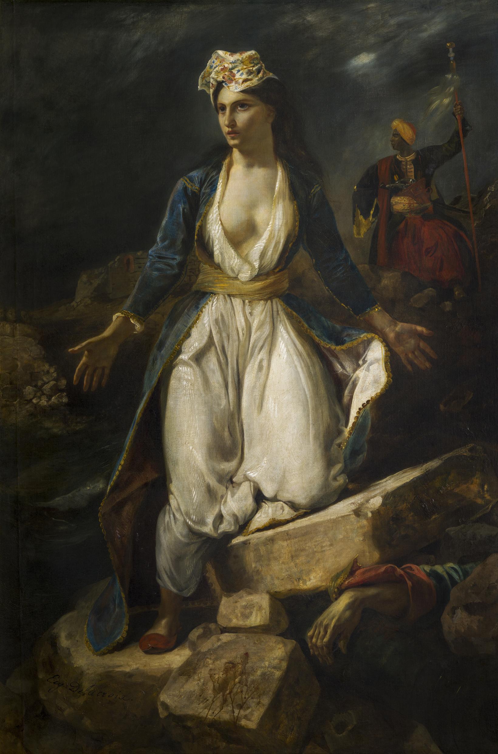 Ο Ντελακρουά, ένας από τους σημαντικότερους φιλέλληνες της εποχής, ολοκλήρωσε τον πίνακα το 1826, λίγους μήνες μετά την Έξοδο του Μεσολογγίου που συγκλόνισε την Ευρώπη. Με ύψος 208 εκ. και πλάτος 147 εκ., το έργο έρχεται για πρώτη φορά στην Ελλάδα και παρουσιάζει την Ελλάδα ως πενθούσα γυναίκα, ντυμένη με παραδοσιακή φορεσιά, με το στήθος ανοιχτό, τα χέρια ανοιχτά και το πρόσωπο στραμμένο τρία τέταρτα προς τα αριστερά, να στέκεται πάνω στα ερείπια που καταπλάκωσαν έναν αγωνιστή. Πίσω της, ένας μαύρος άνδρας με κίτρινο τουρμπάνι, που συμβολίζει τον εχθρό, καρφώνει μια σημαία στο έδαφος, ολοκληρώνοντας τη δραματική σύνθεση του πίνακα.