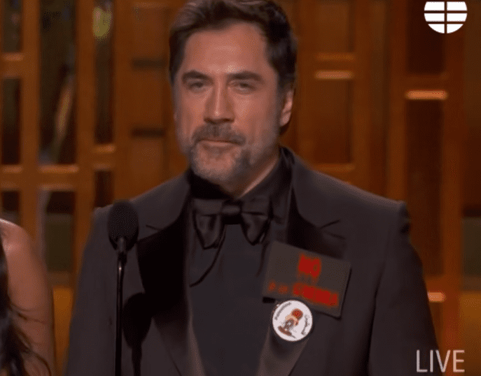 Ο Ισπανός ηθοποιός φορούσε επίσης μια καρφίτσα με το σύνθημα «No a la guerra» («Όχι στον πόλεμο» στα ελληνικά), αλλά και μια ακόμη καρφίτσα με μια δημοφιλή παλαιστινιακή φιγούρα καρτούν – ως ένδειξη υποστήριξης στην Παλαιστίνη – στο πέτο του σμόκιν του.