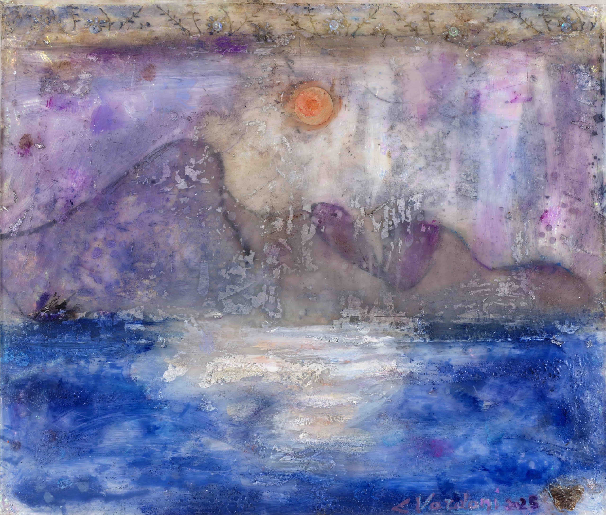 Μέσα από ετερόκλητα υλικά και διαβαθμίσεις ψυχρών τόνων, η Βορδώνη οικοδομεί έναν ονειρικό, σχεδόν αιωρούμενο κόσμο, όπου η ύλη μοιάζει να διαλύεται, για να συνομιλήσει με το άυλο. Οι ψυχρές εντάσεις μετασχηματίζονται σε απροσδόκητες εκρήξεις φωτός, εμψυχώνοντας την επιφάνεια των έργων χαρίζοντάς τους μια αίσθηση παλλόμενης ζωής.