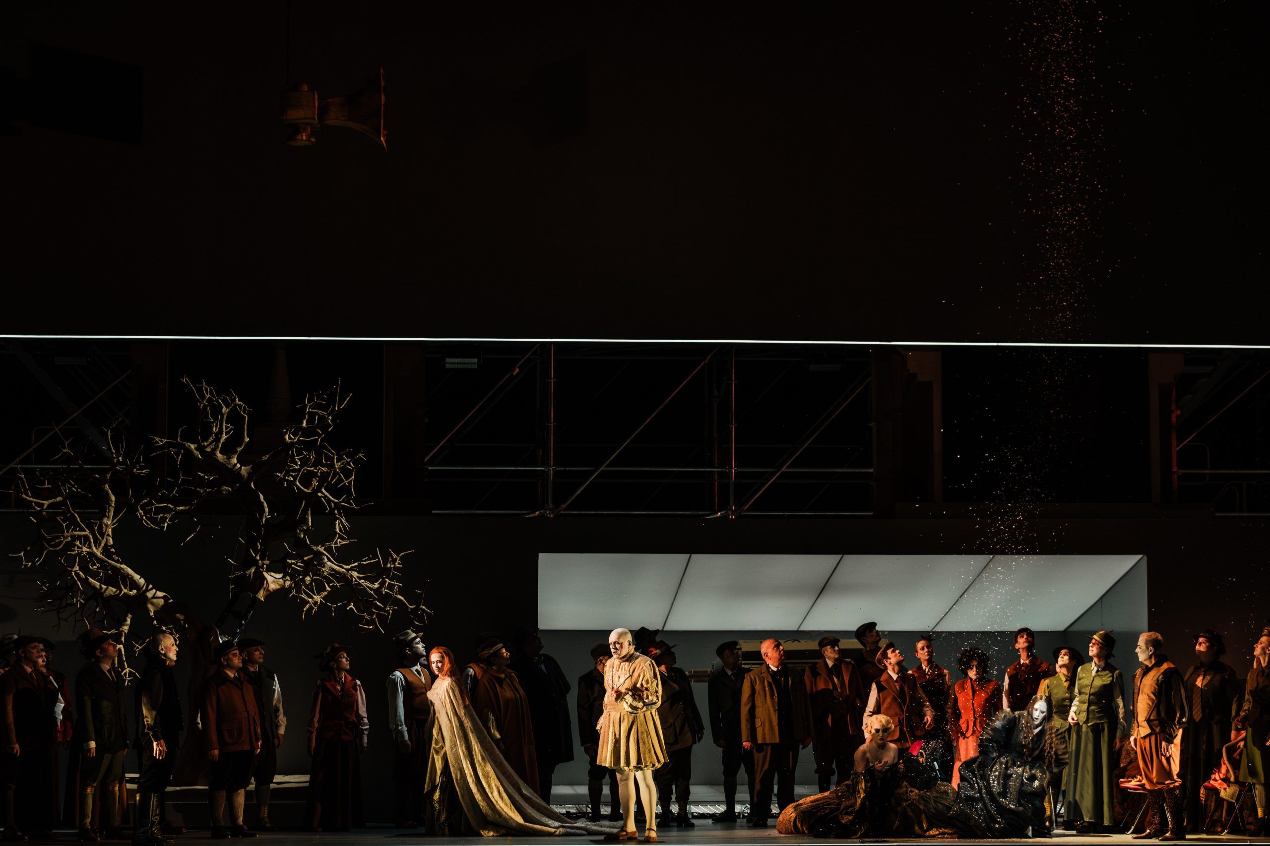 Το σκηνικό οργανώνεται ως αρχειακό οικοσύστημα, όπου η Α΄ Πράξη ισορροπεί ανάμεσα στην επίκληση της ιστορικής πιστότητας και την αποκάλυψη της ιστορίας ως αντιγράφου, ενώ στη Β΄ Πράξη ο χώρος μετατρέπεται σε μουσείο, όπου αντικείμενα και πρόσωπα εκτίθενται ως τεκμήρια μιας παγιωμένης αφήγησης. Παράλληλα, το ηχητικό περιβάλλον που δημιουργείται για την παράσταση λειτουργεί ως αρχειακή παρέμβαση που διακόπτει την αυτάρκεια του μπελ κάντο, φέρνοντας στο προσκήνιο τη βία που το έργο έχει αισθητικοποιήσει. Ιδιαίτερη έμφαση δίνεται στη σκηνή της τρέλας, όπου η φωνητική ακρότητα εκτίθεται ως θέαμα και η γυναικεία φωνή ως πεδίο φετιχοποίησης. «Η ιστορία δεν είναι ένα κλειστό αφήγημα προς αναπαράσταση, αλλά ένας ζωντανός μηχανισμός που μας διαμορφώνει», επισημαίνει ο σκηνοθέτης, προτείνοντας μια παράσταση που δεν αναπαριστά απλώς το παρελθόν, αλλά δοκιμάζει τα όρια της δικής μας σχέσης μαζί του.