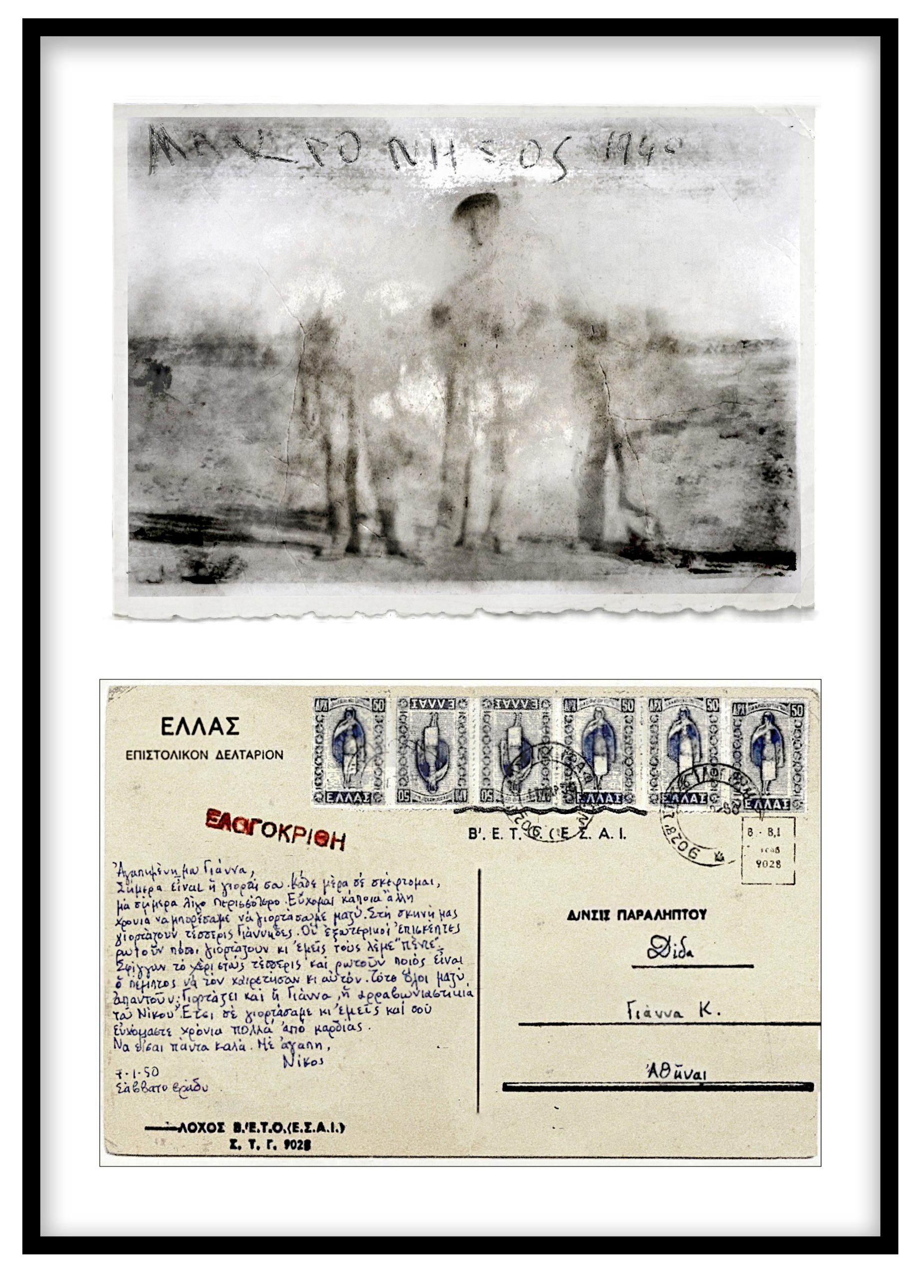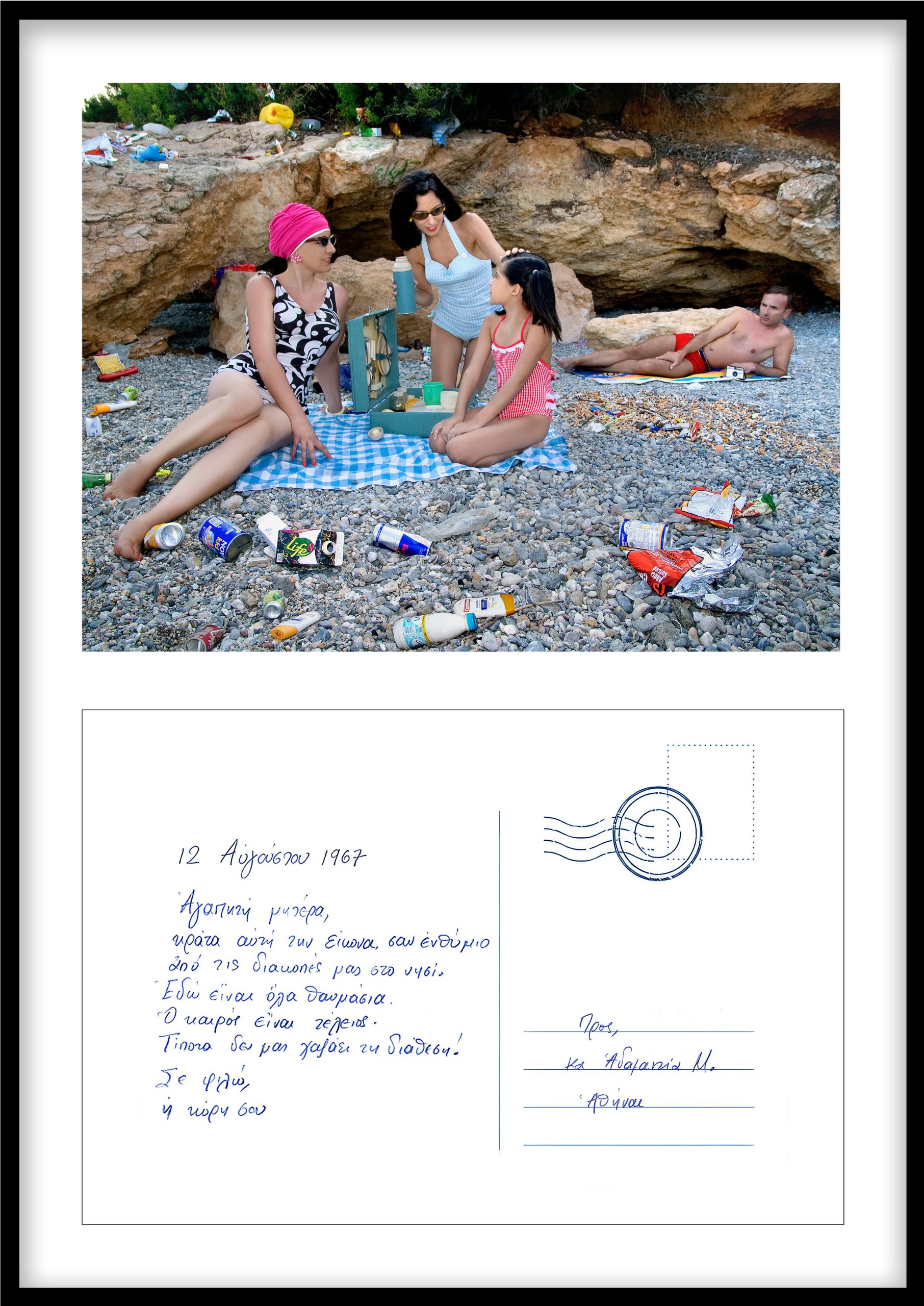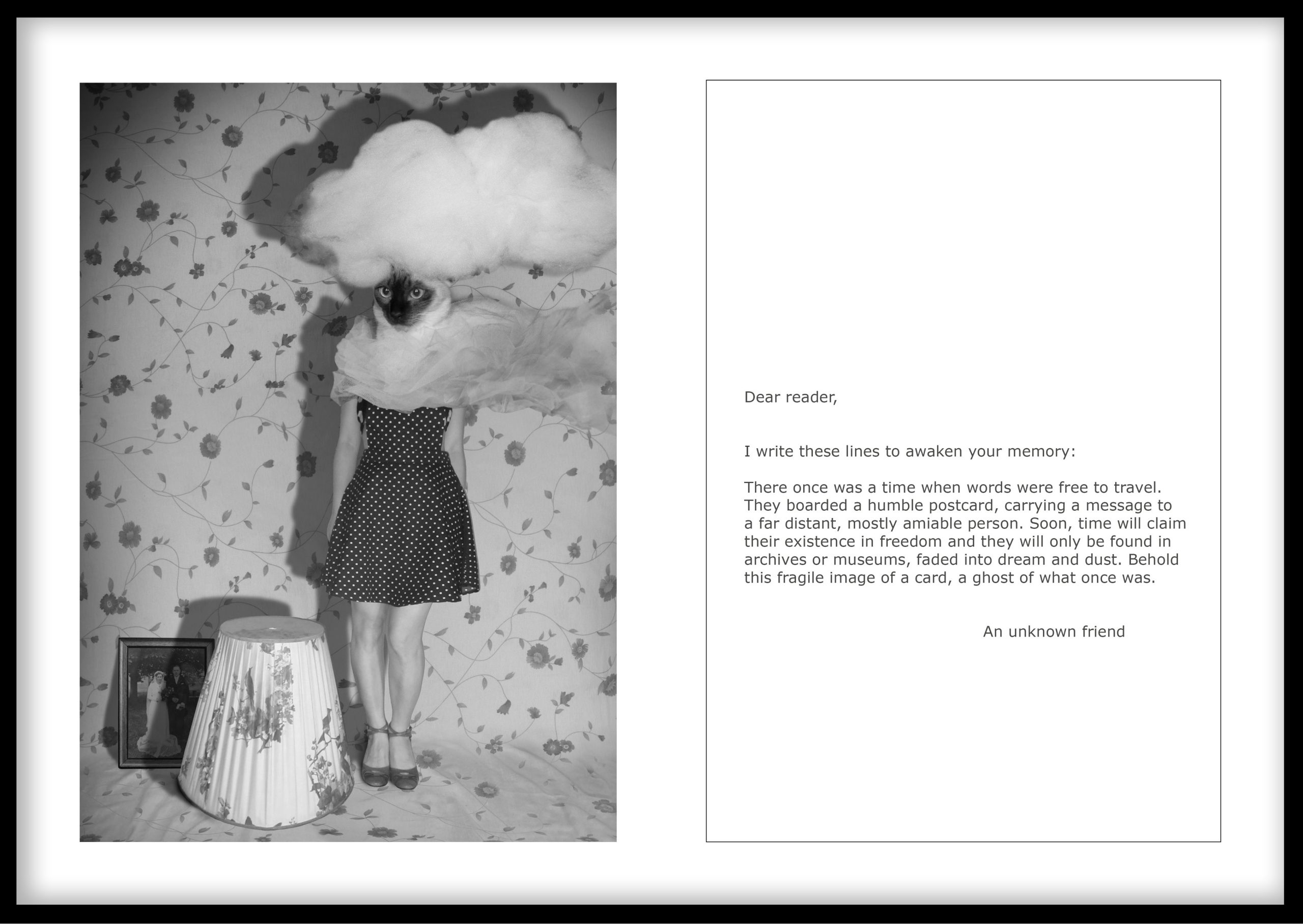 Η έκθεση αντλεί έμπνευση από την έννοια της καρτ ποστάλωςίχνος μιας στιγμής και μιας πρόθεσης. Kάθε φωτογραφία συνοδεύεται από την αναπαραγωγή της πίσω όψης της, όπου αποκαλύπτεται το μήνυμα, χειρόγραφο ή δακτυλογραφημένο, ενίοτε το όνομα του παραλήπτη, κάποιες φορές ένα μικρό σκίτσο ή ακόμη και η σιωπή μιας κενής επιφάνειας.