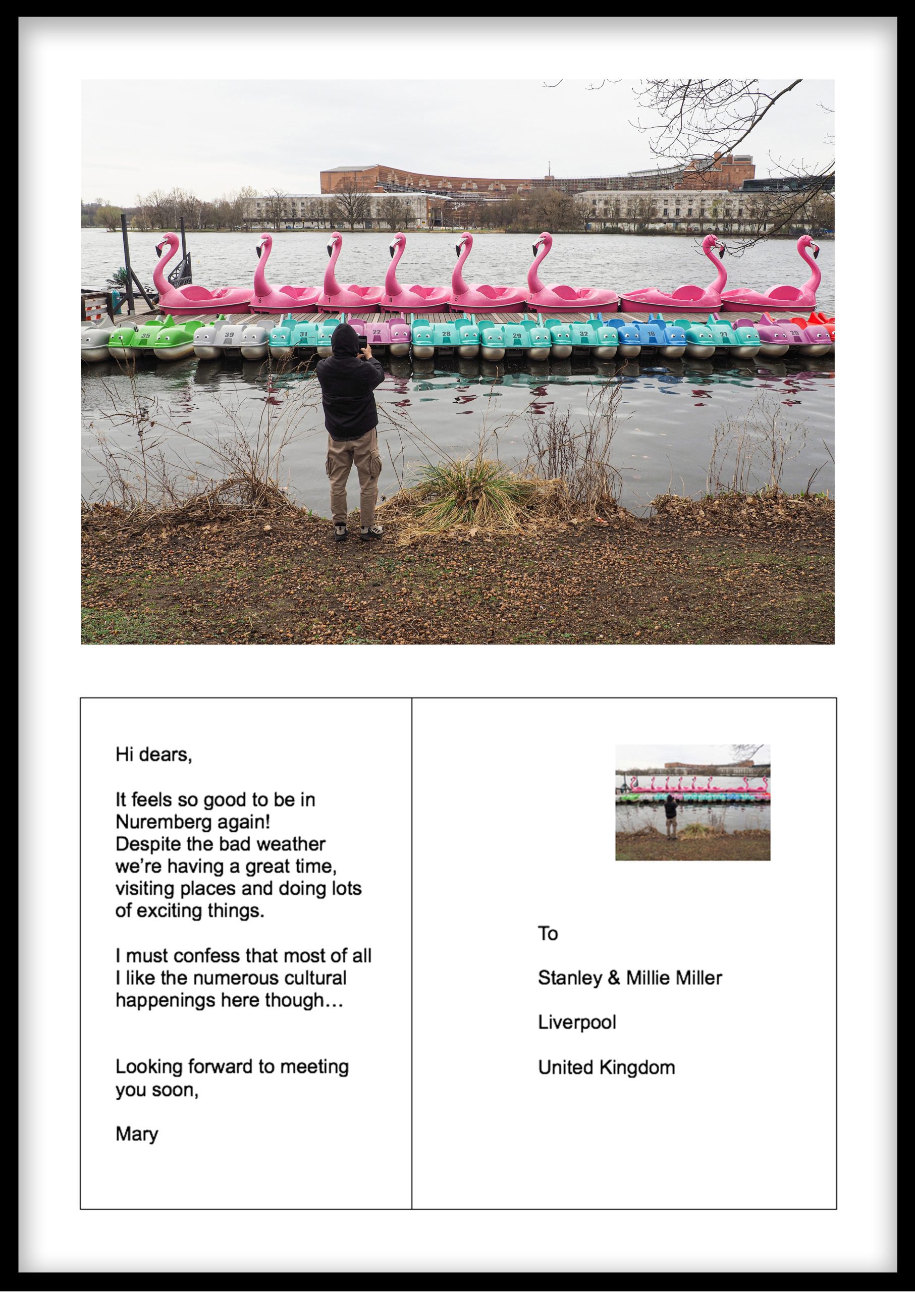 Μερικές καρτ ποστάλ απευθύνονται σε αγαπημένα πρόσωπα που έχουν φύγει από τη ζωή· άλλες στρέφονται προς ένα φίλο, ένα γονέα ή έναν άγνωστο. Ιδιαίτερα συγκινητική είναι η συχνότητα με την οποία οι δημιουργοί απευθύνονται στον ίδιο τους τον εαυτό– σαν να στέλνουν ένα μήνυμα προς το παρελθόν ή το μέλλον τους.
