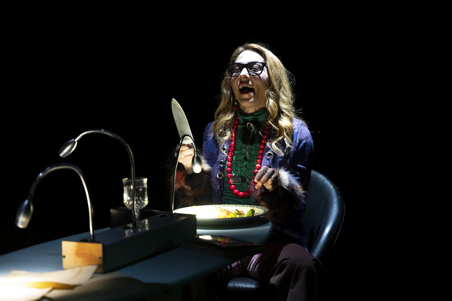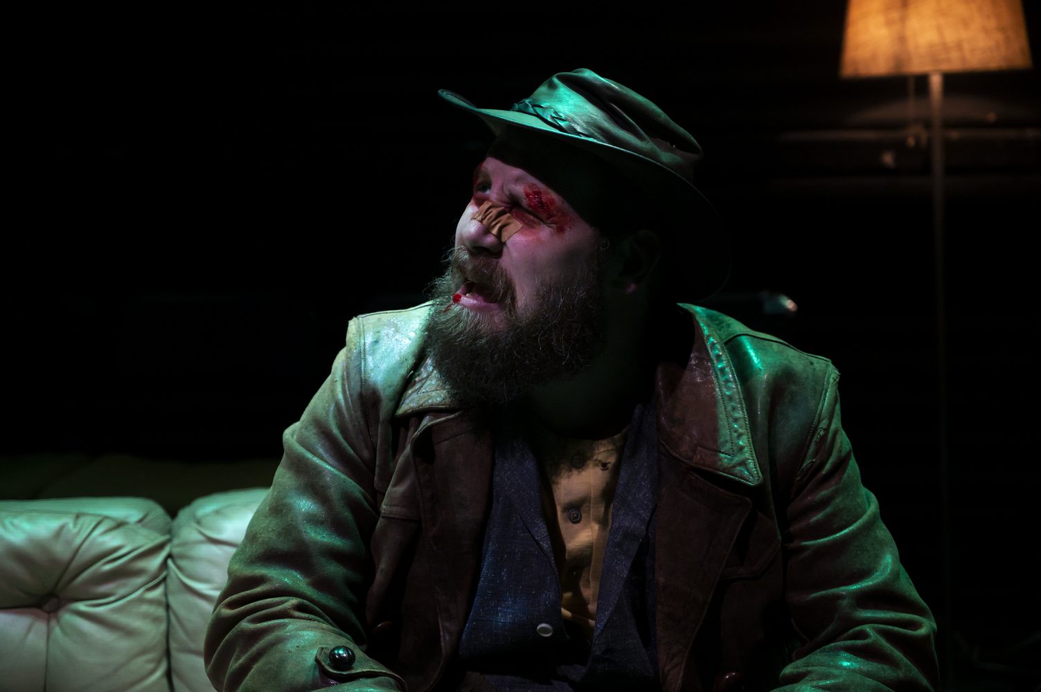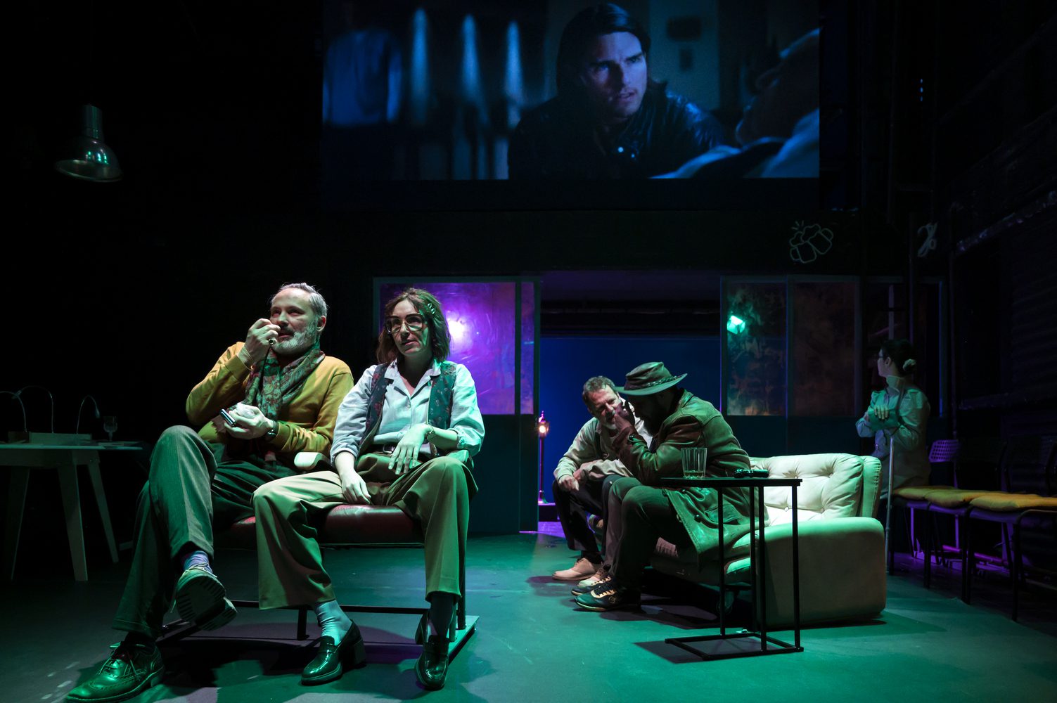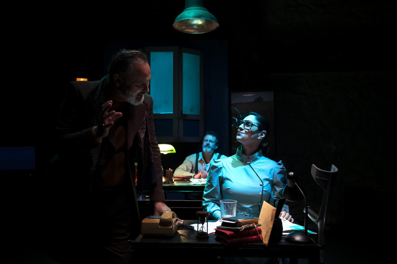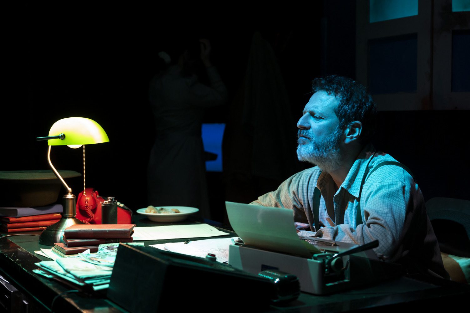Η ατμόσφαιρα μιας νουάρ νουβέλας ή ενός αστυνομικού σίριαλ των 30s κυριαρχούν στο οπτικό αποτέλεσμα της παράστασης – πάντα προσεγμένο στις παραγωγές του Rabbithole. Ο Γιώργος Σίμωνας από τη θέση του σκηνογράφου έχει δημιουργήσει μικρούς σκηνικούς κόσμους που ‘φωτίζονται’ εκ περιτροπής, παρασύροντας τους θεατές στις γωνίες του μυαλού του ήρωα του – όπως αναφέρεται και στο κείμενο της διασκευής: «του μιλάνε οι σκέψεις και οι σκέψεις τον σκορπίζουν». Σημαντικό ρόλο στο περιβάλλον της παράστασης παίζουν οι φωτισμοί του Γιώργου Βλαχονικολού ενώ ωραία – αν και εκτός εποχής του έργου – είναι τα κοστούμια της Δήμητρας Λιάκουρα.