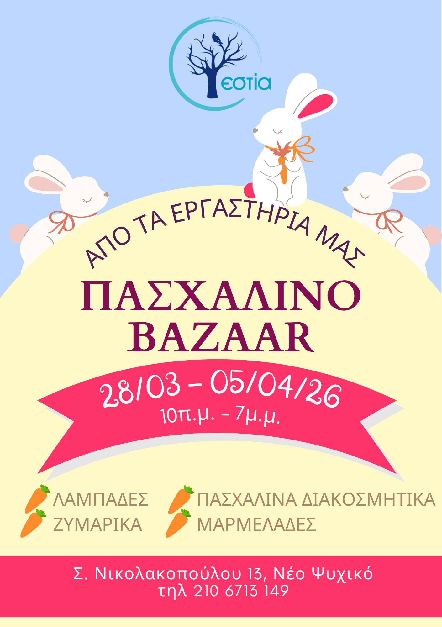 Το φετινό πασχαλινό μπαζάαρ του Κέντρου Κοινωνικής Φροντίδας Ατόμων με Νοητική Στέρηση «Εστία» υποδέχεται το κοινό, έως τις 5 Απριλίου, στους χώρους της «Εστίας» στο Νέο Ψυχικό. Εκεί θα βρείτε παραδοσιακά κουλουράκια της Λαμπρής, αλλά και τσουρέκια και όλα τα πεντανόστιμα που φτιάχνουν τα παιδιά στο Εργαστήριο Αρτοζαχαροπλαστικής, μαρμελάδες, λικέρ, χειροποίητα ζυμαρικά, λαμπάδες σε κάθε στυλ, πασχαλινά διακοσμητικά, κουνελάκια και φυσικά πασχαλινά αυγά. Όλα αυτά από τα εργαστήρια της Εστίας και τους εκπαιδευομένους που έχουν βάλει τη σφραγίδα τους σε όλα τα στάδια της κατασκευής, της προετοιμασίας και της συσκευασίας.