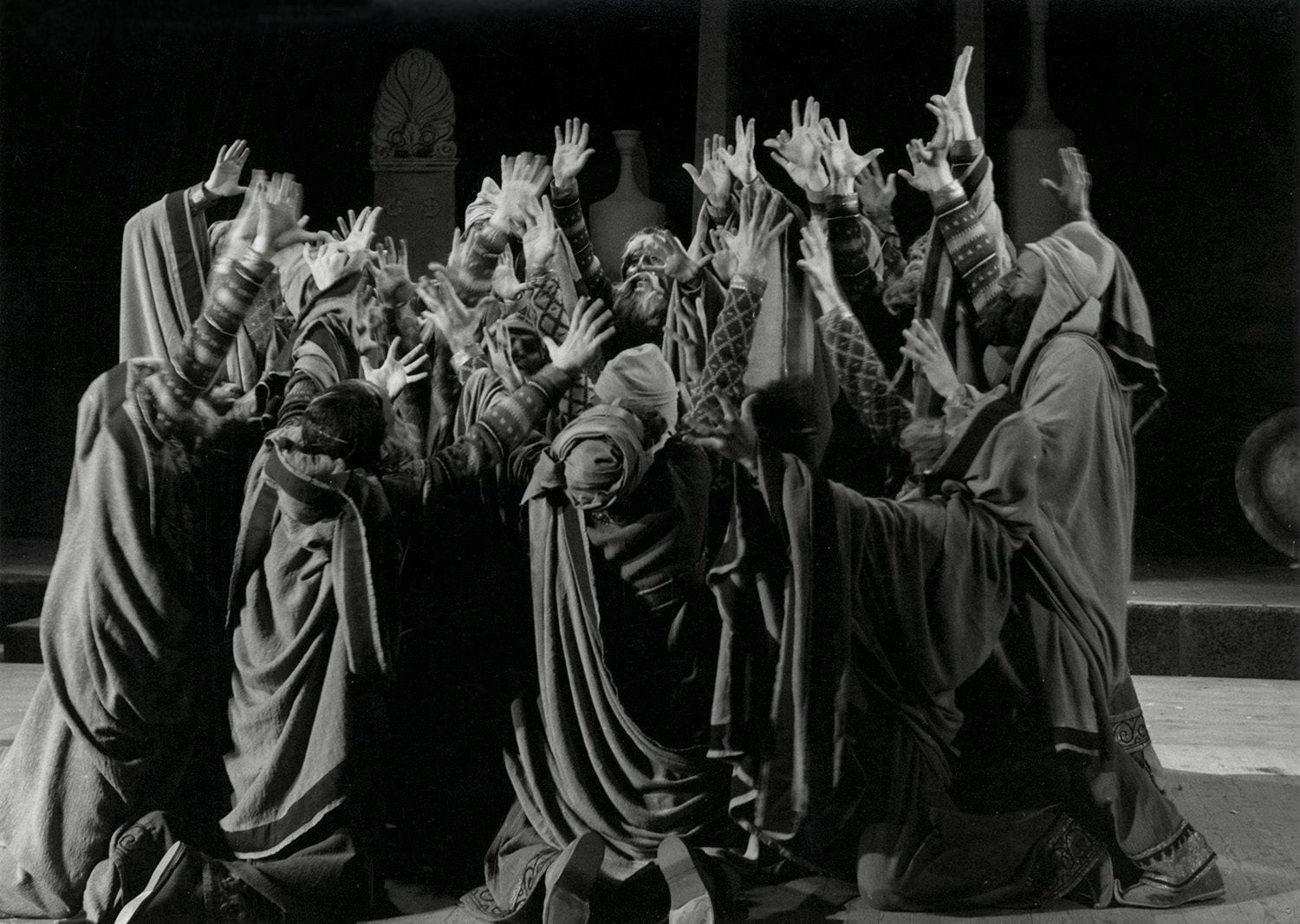 Αισχύλου Πέρσαι, 1965. Στιγμιότυπο από την παράσταση του Θεάτρου Τέχνης, σε σκηνοθεσία του Καρόλου Κουν. Φυλάσσεται στο Αρχείο Γιάννη Χρήστου / Κέντρο Ερευνών και Τεκμηρίωσης Ωδείου Αθηνών
