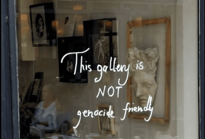 Η γνωστή γκαλερί στου Ψυρρή είχε εκφράσει την αλληλεγγύη της στον λαό της Παλαιστίνης, έχοντας γράψει στην βιτρίνα της το μήνυμα: “This gallery is not genocide friendly”.
