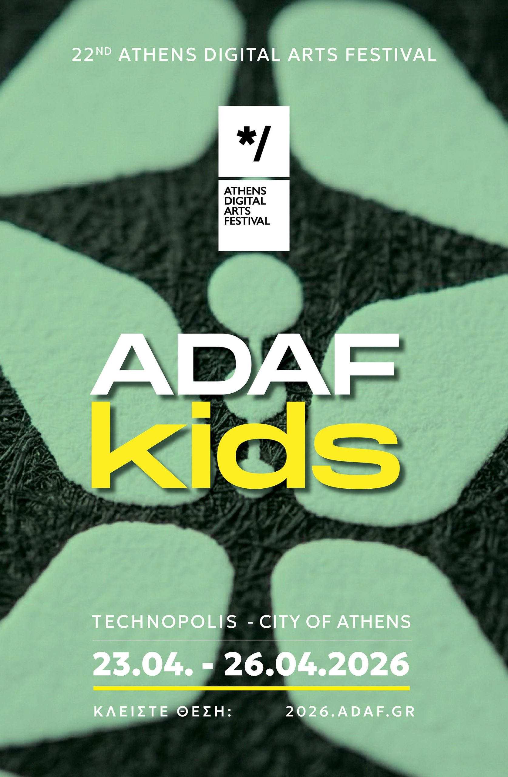 Στο πλαίσιο της κύριας διοργάνωσης, το ADAF KIDS προσκαλεί κάθε παιδί σε έναν κόσμο γεμάτο φαντασία, τεχνολογία και παιχνίδι. Από την Πέμπτη 23 Απριλίου μέχρι και την Κυριακή 26 Απριλίου 2026, η Τεχνόπολη Δήμου Αθηναίων μεταμορφώνεται σε ένα διαδραστικό playground, όπου κάθε παιδί θα ανακαλύψει τη μαγεία της ψηφιακής τέχνης μέσα από διαδραστικά installations, animation, εκπαιδευτικά εργαστήρια και VR.