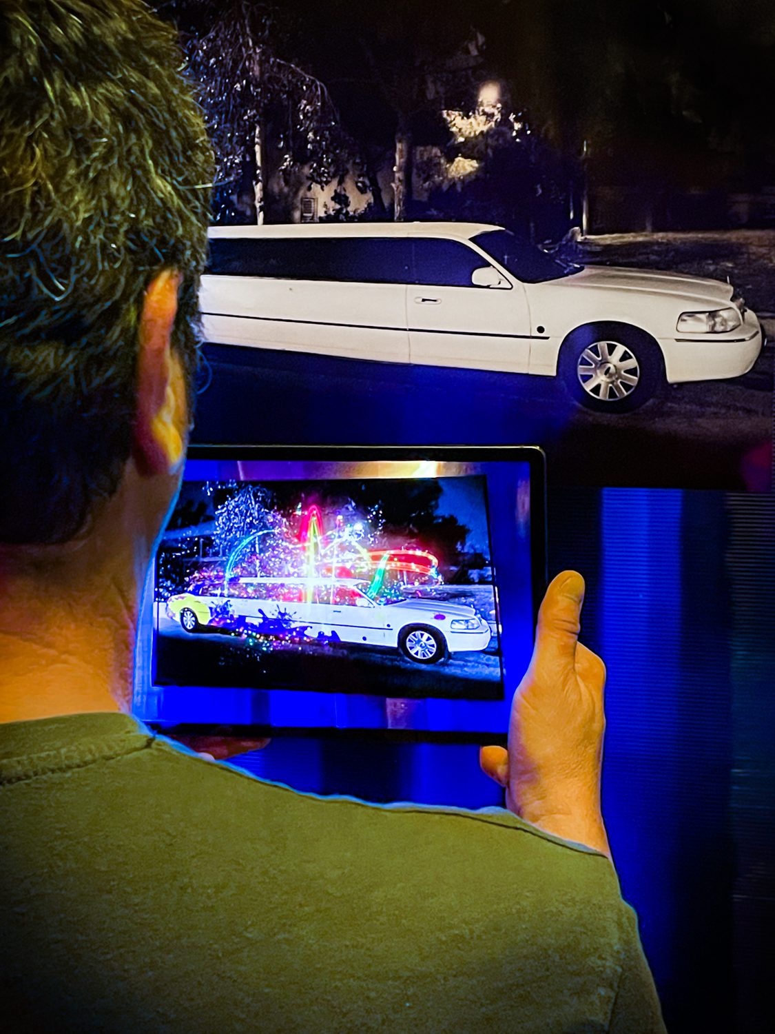 Ο σκηνοθέτης Βύρων Νικολόπουλος καθώς παρεμβαίνει στο ασπρόμαυρο κάδρο της λιμουζίνας.