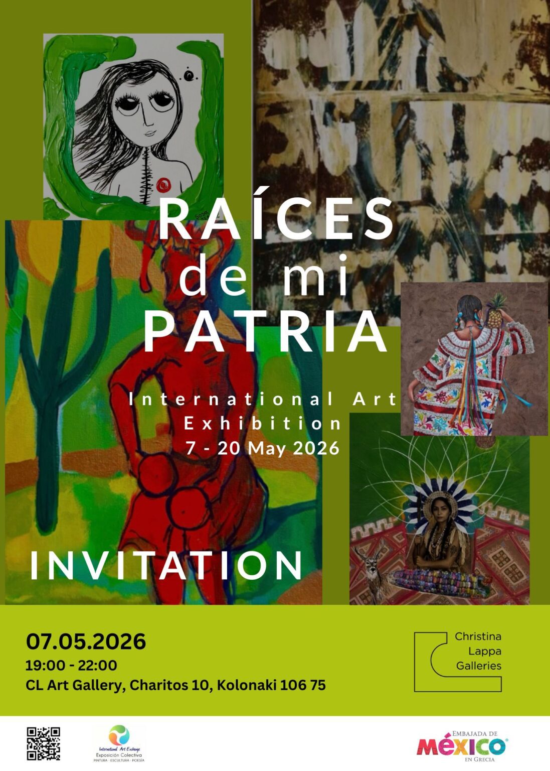 Η CL Art Gallery παρουσιάζει στην Αθήνα τη διεθνή ομαδική έκθεση τέχνης με τίτλο «Raíces de mi Patria» (Οι Ρίζες της Πατρίδας μου), μία πολυδιάστατη εικαστική συνάντηση καλλιτεχνών από το Μεξικό και άλλες χώρες, σε συνεργασία με την Πρεσβεία του Μεξικου στην Αθήνα, που αναδεικνύει τη σύγχρονη καλλιτεχνική δημιουργία μέσα από διαφορετικά πολιτισμικά βλέμματα.