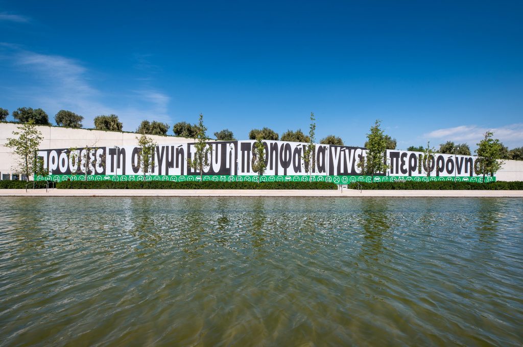 Στον χώρο της Εσπλανάδας δεσπόζει μια τοιχογραφία μήκους 90 μ., που καλύπτει τον εξωτερικό τοίχο του κτιρίου της Εθνικής Βιβλιοθήκης και αποτελεί τον πυρήνα της έκθεσης, όπου αποτυπώνεται η προειδοποίηση: «Πρόσεξε τη στιγμή που η περηφάνια γίνεται περιφρόνηση». Πρόκειται για ένα μήνυμα σκόπιμα ανοιχτό σε ερμηνεία, όπως τόνισε, παρουσιάζοντας την έκθεση, η επιμελήτριά της, Κατερίνα Σταθοπούλου, το οποίο καλεί το κοινό να αναρωτηθεί για την αλαζονεία και τις συνθήκες που τη γεννούν. Το κάτω μέρος της τοιχογραφίας καλύπτει μια φρίζα από emojies, που αποτελεί «μια διεθνή ψηφιακή γλώσσα χωρίς σύνορα, η οποία μπορεί να εκφράσει συναισθήματα».