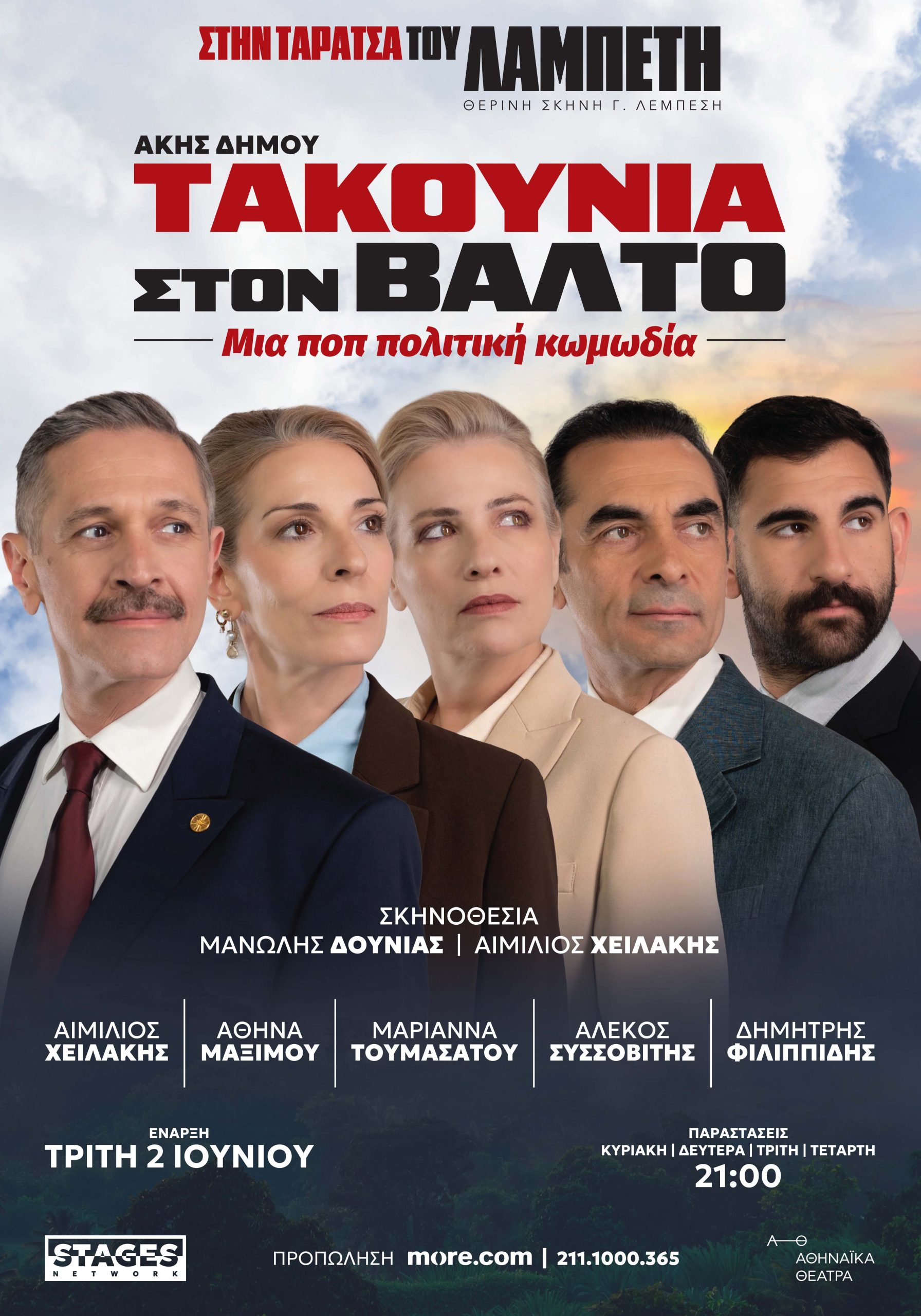 Ο Μανώλης Δούνιας και ο Αιμίλιος Χειλάκης παρουσιάζουν στην ταράτσα του Λαμπέτη και σε καλοκαιρινή περιοδεία σε όλη την Ελλάδα το νέο έργο του Άκη Δήμου, μια ποπ πολιτική κωμωδία με τίτλο «Τακούνια στον Βάλτο».