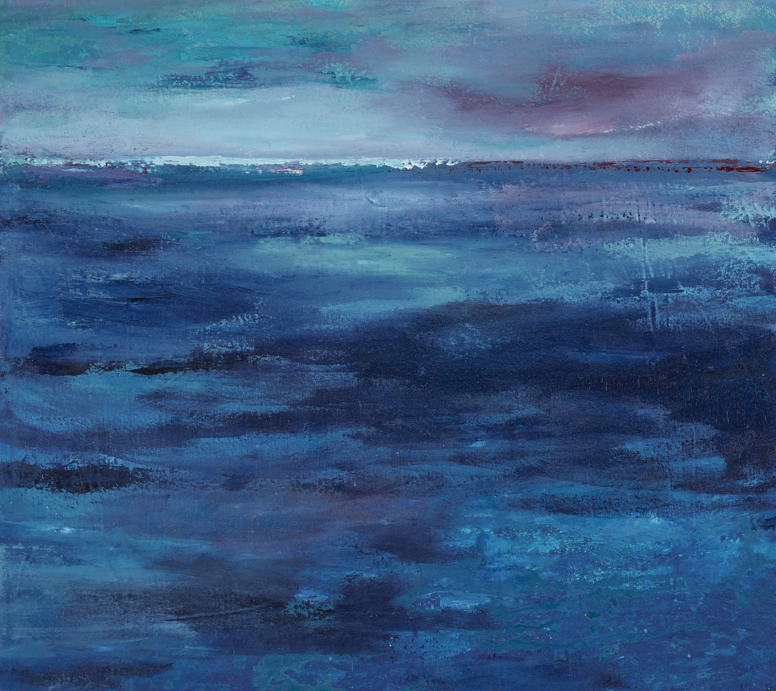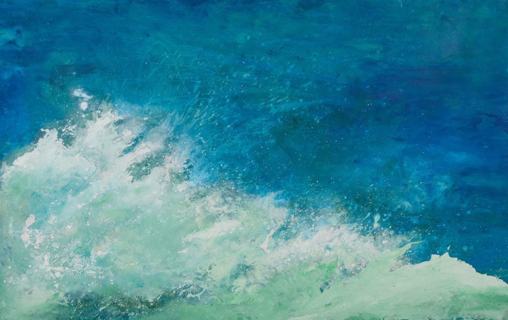 Το μπλε, σε πυκνές και διάχυτες εκδοχές του, συνομιλεί με γαλαζοπράσινες ποιότητες σχηματίζοντας αλλεπάλληλα ημιδιαφανή στρώματα. Εκεί γεννιέται μια διττή εμπειρία, η αίσθηση της κατάδυσης σε έναν αέναο υδάτινο κόσμο και ταυτόχρονα η υπόγεια μνήμη μιας πρωταρχικής στιγμής, μιας γέννησης. Όχι απαραίτητα ανθρώπινης, αλλά μιας ζωής, ενός μικροοργανισμού, μιας γης ή ακόμη και μιας σκέψης που μόλις αρχίζει να παίρνει μορφή. Σαν μια αρχή που δεν δηλώνεται αλλά υπονοείται.