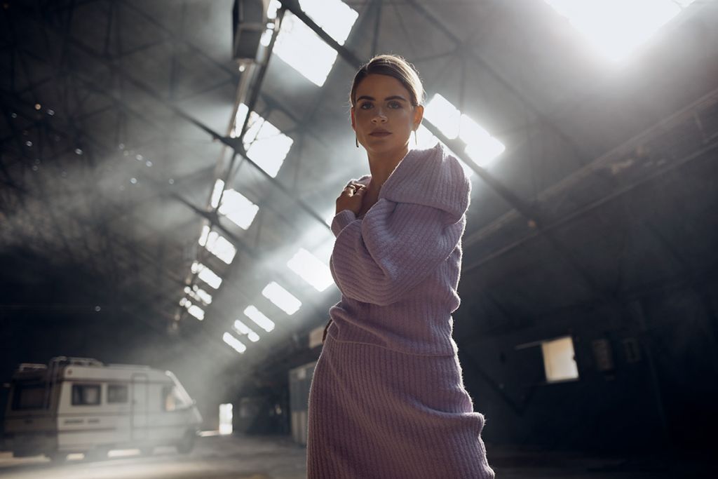 Φόρεμα MILKWHITE. Παλτό VASIA TZOTZOPOULOU (PASSION ALLEY). Μποτάκια JEFFREY CAMPELL (FAVELA). Δερμάτινη Πολυθρόνα BUTTERFLY COGNAC (PRAKTIKER).