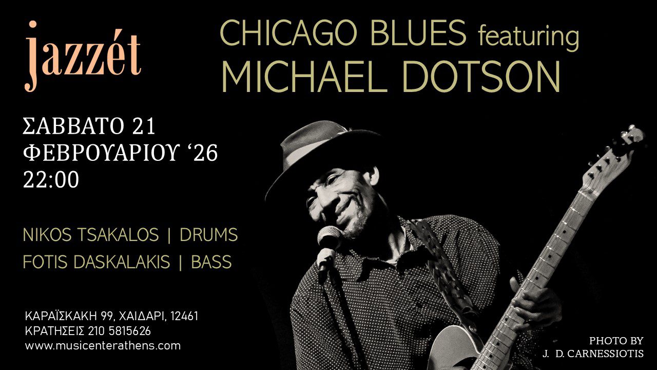 Το Jazzèt Music Hall υποδέχεται το Σάββατο 21 Φεβρουαρίου, για μία ακόμη φορά μετά τις sold out εμφανίσεις του, έναν από τους πιο αυθεντικούς εκφραστές του Chicago Blues: τον εκρηκτικό κιθαρίστα, τραγουδιστή και συνθέτη Michael Dotson. Μια βραδιά ατόφιου “house-rockin’ blues”, με ένταση, groove και ατμόσφαιρα κατευθείαν από τα ιστορικά blues clubs του Σικάγου.