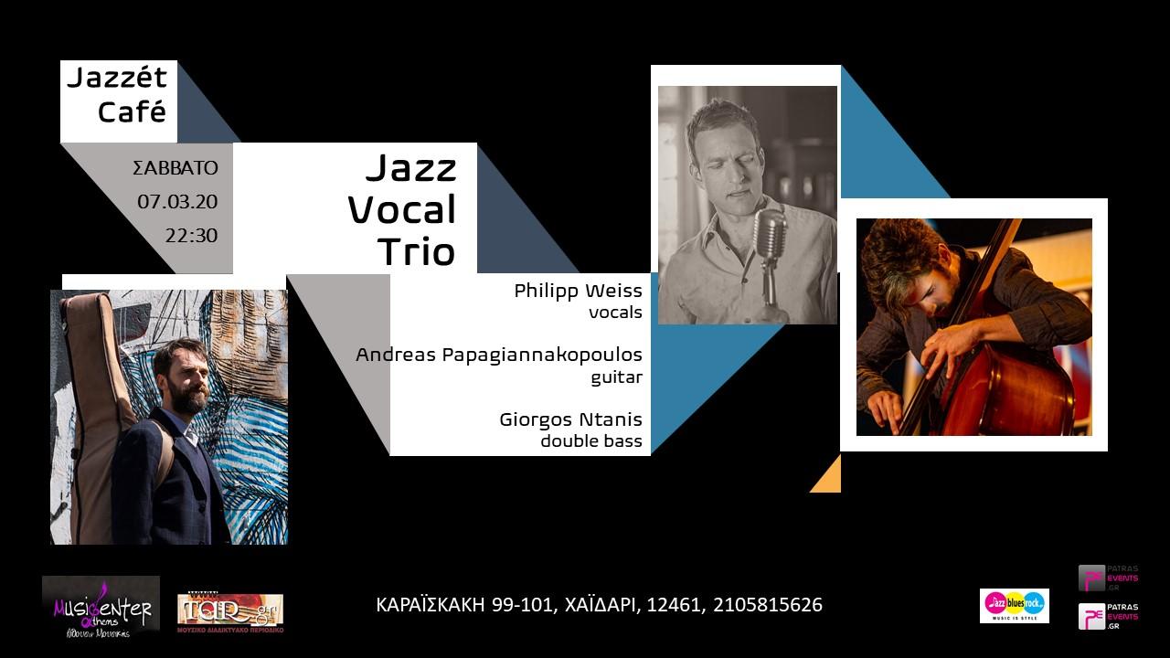 Το Σάββατο 7 Μαρτίου το εξαίσιο Jazz Vocal Trio που απαρτίζεται από τους Philipp Weiss στα φωνητικά, ο Aνδρέας Παπαγιαννακόπουλος στην κιθάρα και ο Γιώργος Ντάνης στο κοντραμπάσο συναντώνται μουσικά στο φιλόξενο Jazzét Café για να γοητεύσουν το φιλόμουσο κοινό του.