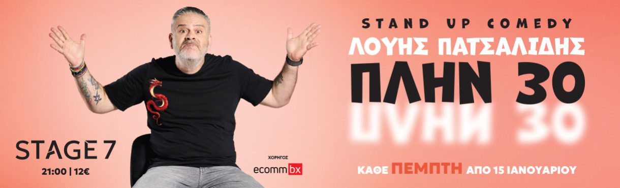 Ο Κύπριος κωμικός Λούης Πατσαλίδης, παρουσιαστής του δημοφιλέστερου σατιρικού show στην κυπριακή τηλεόραση με τον τίτλο «Λούης Night Show», φέρνει το εκρηκτικό του χιούμορ στο νέο πολιτιστικό στέκι της Αθήνας «Stage 7» με την παράσταση του «ΠΛΗΝ 30».