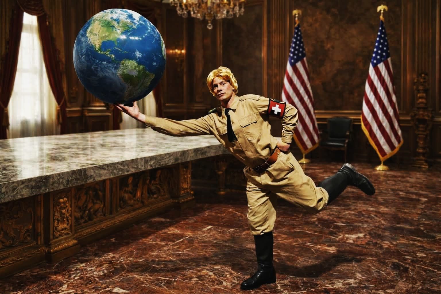 Ο Μεγάλος Δικτάτωρ, η νέα παράσταση του Ανδρέα Ζαφείρη, βασισμένη στο κινηματογραφικό αριστούργημα του Τσάρλι Τσάπλιν, είναι μια ανελέητη αντιπολεμική, αντιφασιστική σάτυρα.