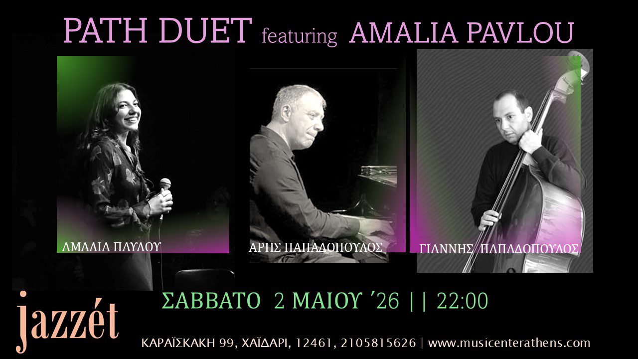 Μια ξεχωριστή μουσική συνάντηση φιλοξενείται το Σάββατο 2 Μαΐου στο Jazzèt Music Hall, όπου το PATH Duet ενώνει τις δυνάμεις του με την ιδιαίτερη φωνή της Αμαλίας Παύλου σε μια βραδιά σύγχρονης jazz αισθητικής και αυτοσχεδιασμού.