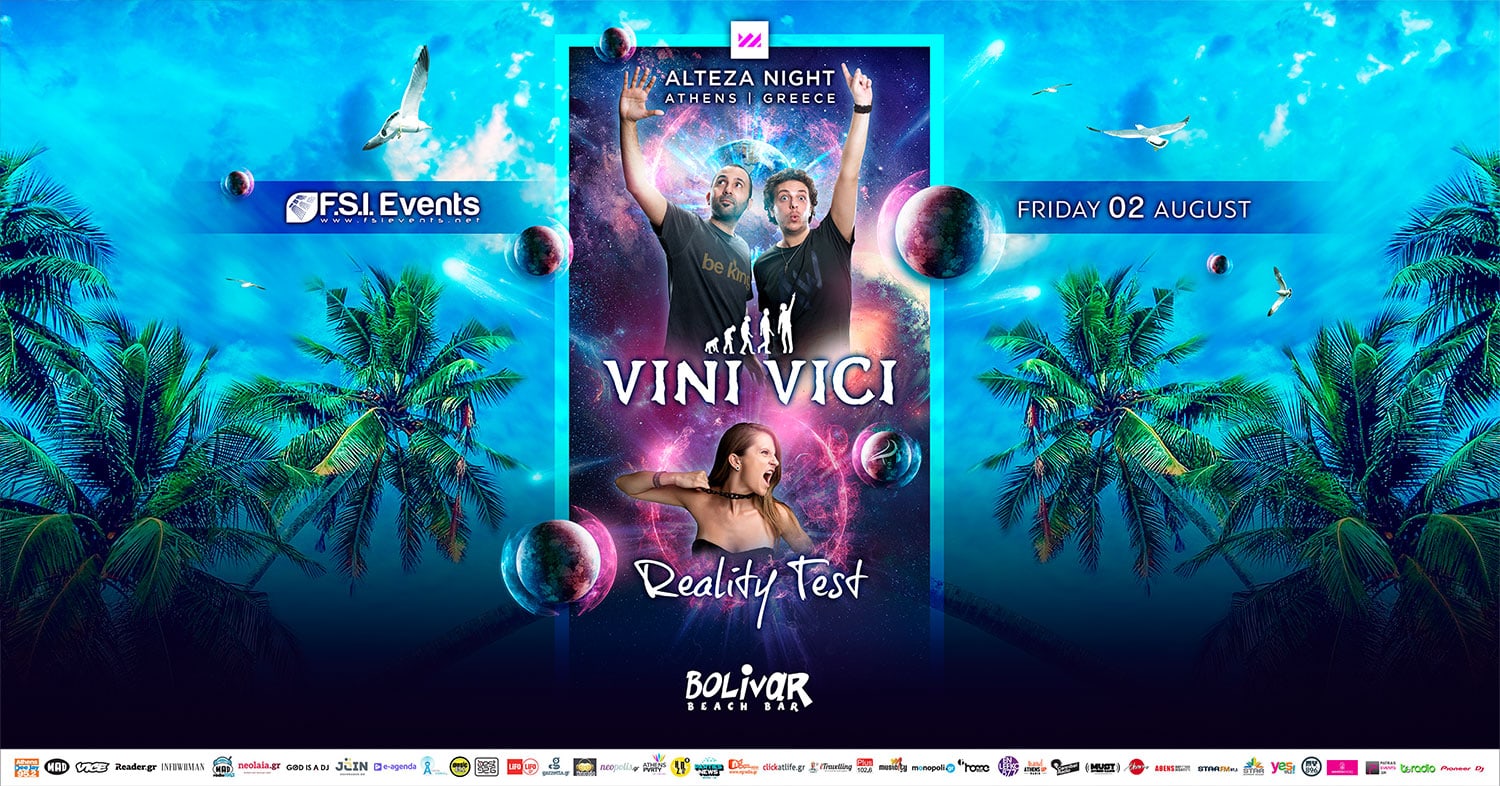 Tην Παρασκευή 2 Αυγούστου στην Αθήνα, καταφτάνει το πιο επίκαιρο, χορευτικό και ήδη χαρακτηρισμένο ως το highlight act της φετινής dance φεστιβαλικής σεζόν στον πλανήτη, σχήμα των “VINI VICI”. Μαζί τους η σημαντικότερη γυναίκα παραγωγός της Psy Trance μουσικής «Reality Test» καλεσμένοι της FSI Events, στο Bolivar Beach Bar. Ετοιμαστείτε για ένα ανεπανάληπτο show και μια μοναδική εμφάνιση που θα σας καθηλώσει!
